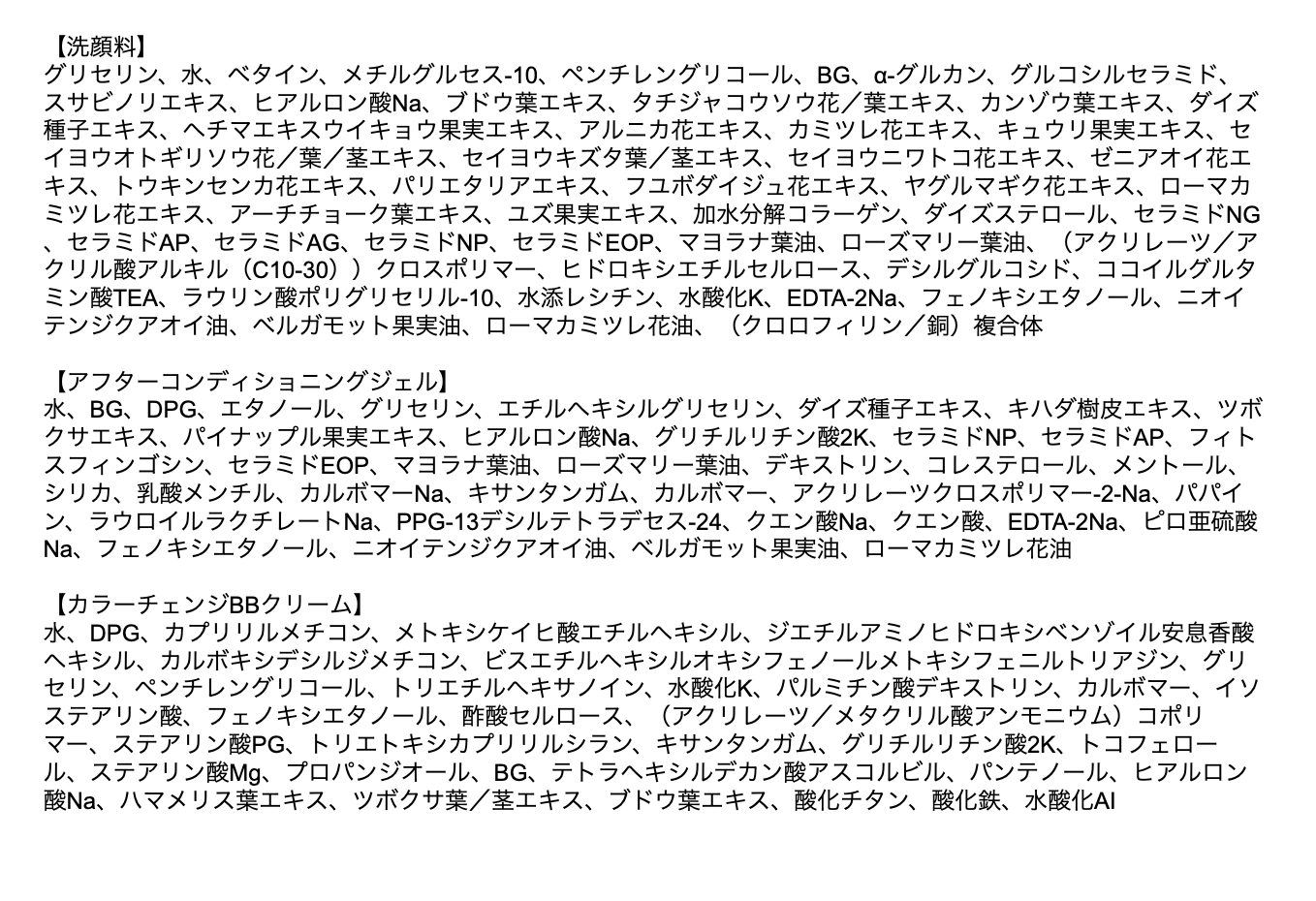 | 内容量 | 【洗顔料】 50g 【アフターコンディショニングジェル】 25g 【カラーチェンジBBクリーム】 25g |
