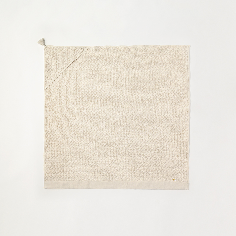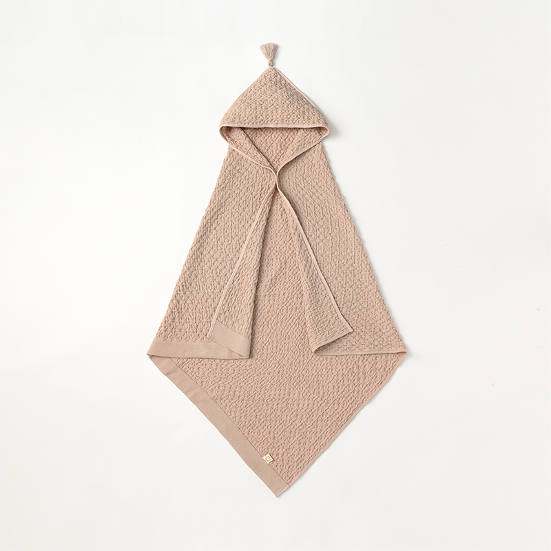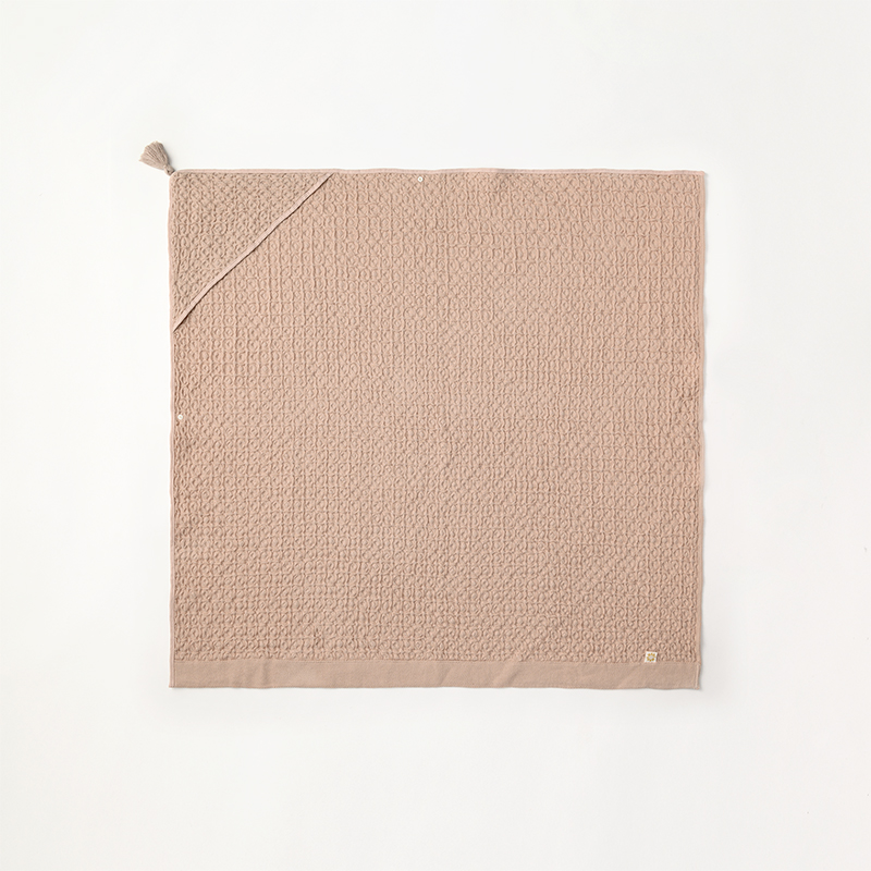赤ちゃんの肌に優しいオーガニックコットン100%のフード付きワッフルタオルです。フード部分のタッセルが後姿のキュートなアクセントに。おくるみやバスタオル、お昼寝のタオルケットとしてもベビーからキッズまでロングユースに活躍します。