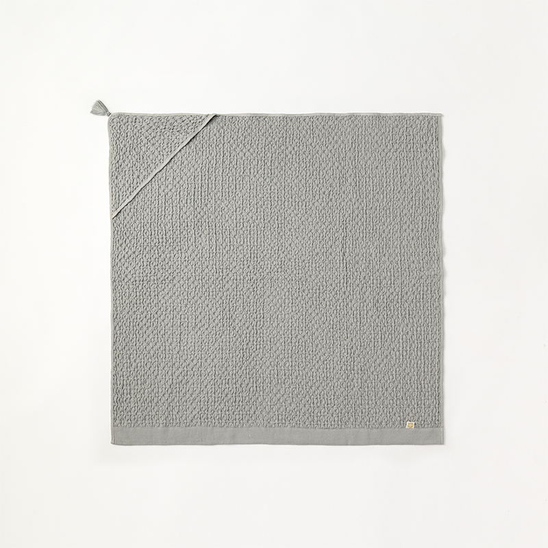 大口注文・法人のお問い合わせはこちらオーガニックコットン100%の肌あたり柔らかなワッフルタオル。 おくるみやバスタオル、お昼寝のタオルケットとしてもベビーからキッズまでロングユースに活躍します。 子どものいる生活に欠かせないタオルをマルチに活用できるよう正方形にしました。また歩けるようになってからもポンチョのように使えるよう、フードとスナップボタンを加えました。