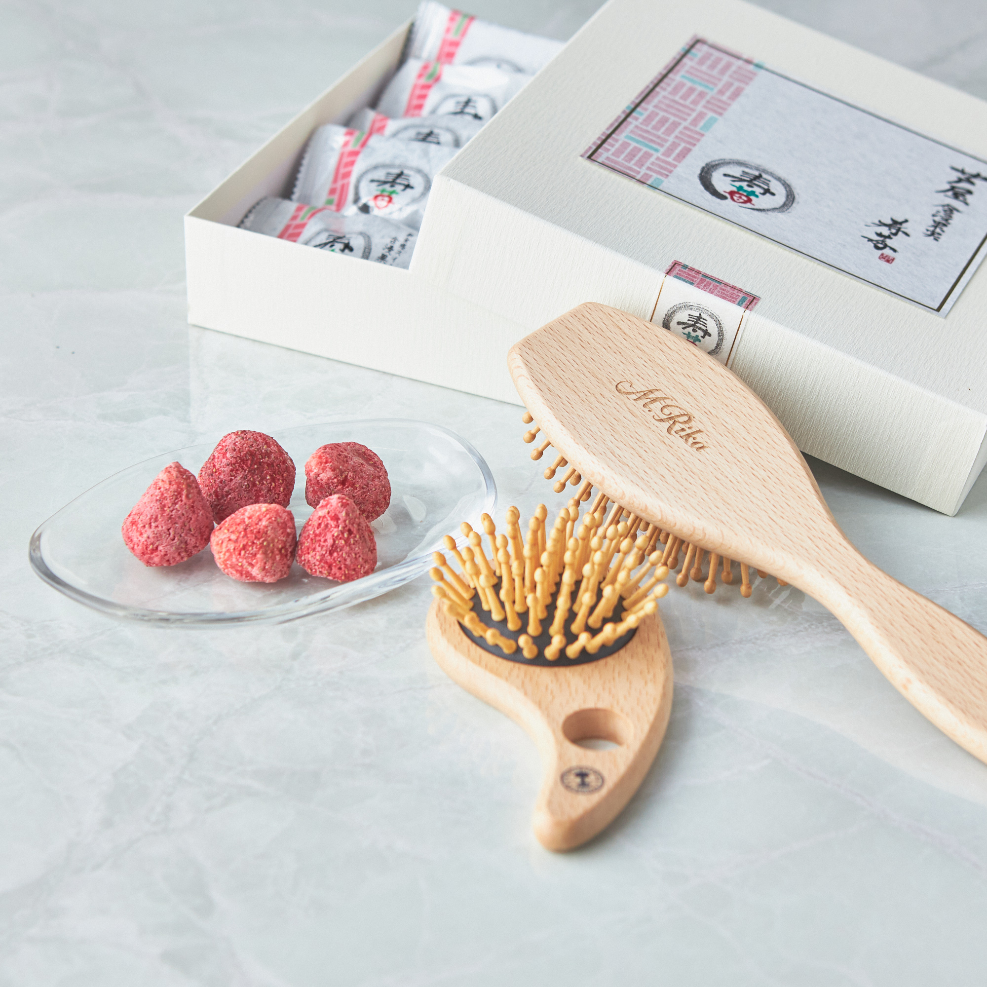 「ル・ボヌール パリス」のフリーズドライの丸ごと苺に独自製法でホワイトチョコレートを染み込ませた寿苺と上質なライフスタイルを提案するホリスティックビューティブランド「NEAL'S YARD REMEDIES(ニールズヤード レメディーズ)」の成長が早くサスティナブルな素材である竹をピンに用いたヘアブラシがセットになりました。※ご選択いただくブラシの種類によって、販売価格が異なります。
