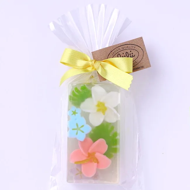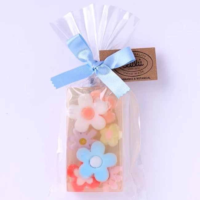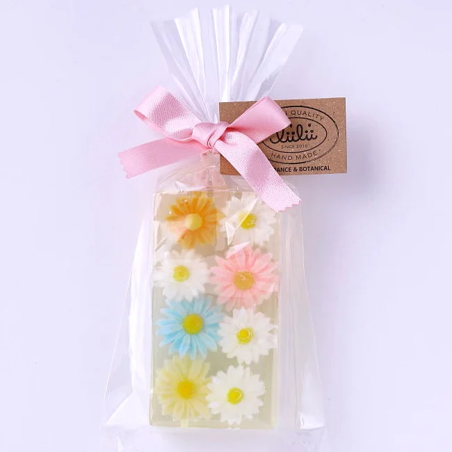 カラフルでポップな花が散りばめられた可愛らしい石鹸。絶妙なグラデーションは完成して初めて分かります。本物のお花と同じく、一輪ずつ色も濃淡も味わいも全て違います。ひとつひとつ手作りで丁寧に作られた、まさにアートな一品は、使ってしまうのがもったいないくらい! ※職人が手作りしているため、お花の色合いや組み合わせはひとつひとつ異なります。