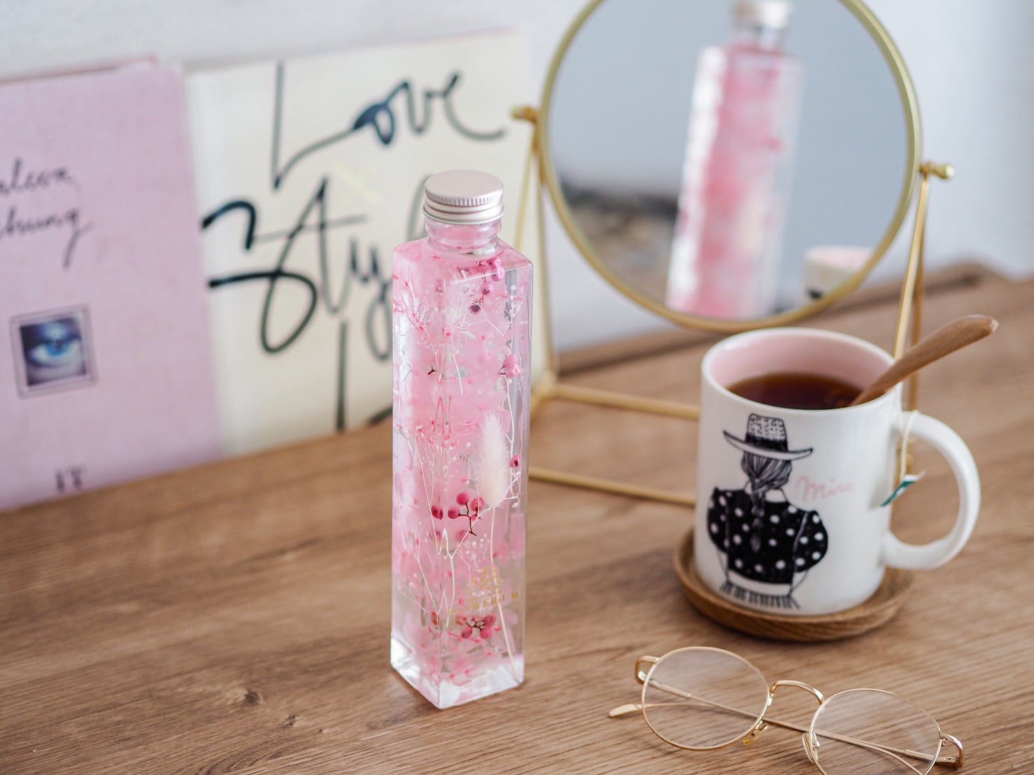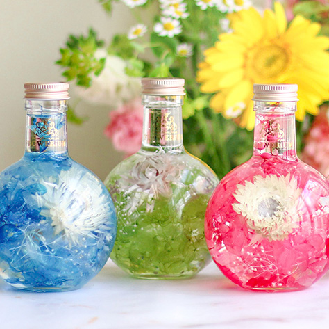スリムでスマートな形は、飾る場所を選ばず空間を華やかに彩ってくれます。ボトルを上下にひっくり返したり、傾けたりすればガラスの中で花がゆっくりと優しく揺れ動きます。光が通過するたびに葉脈が透き通り、キラキラと美しく輝きます。みずみずしさと鮮やかさを得た、生け花とは違う新しい命を吹き込まれた花々をお楽しみください。