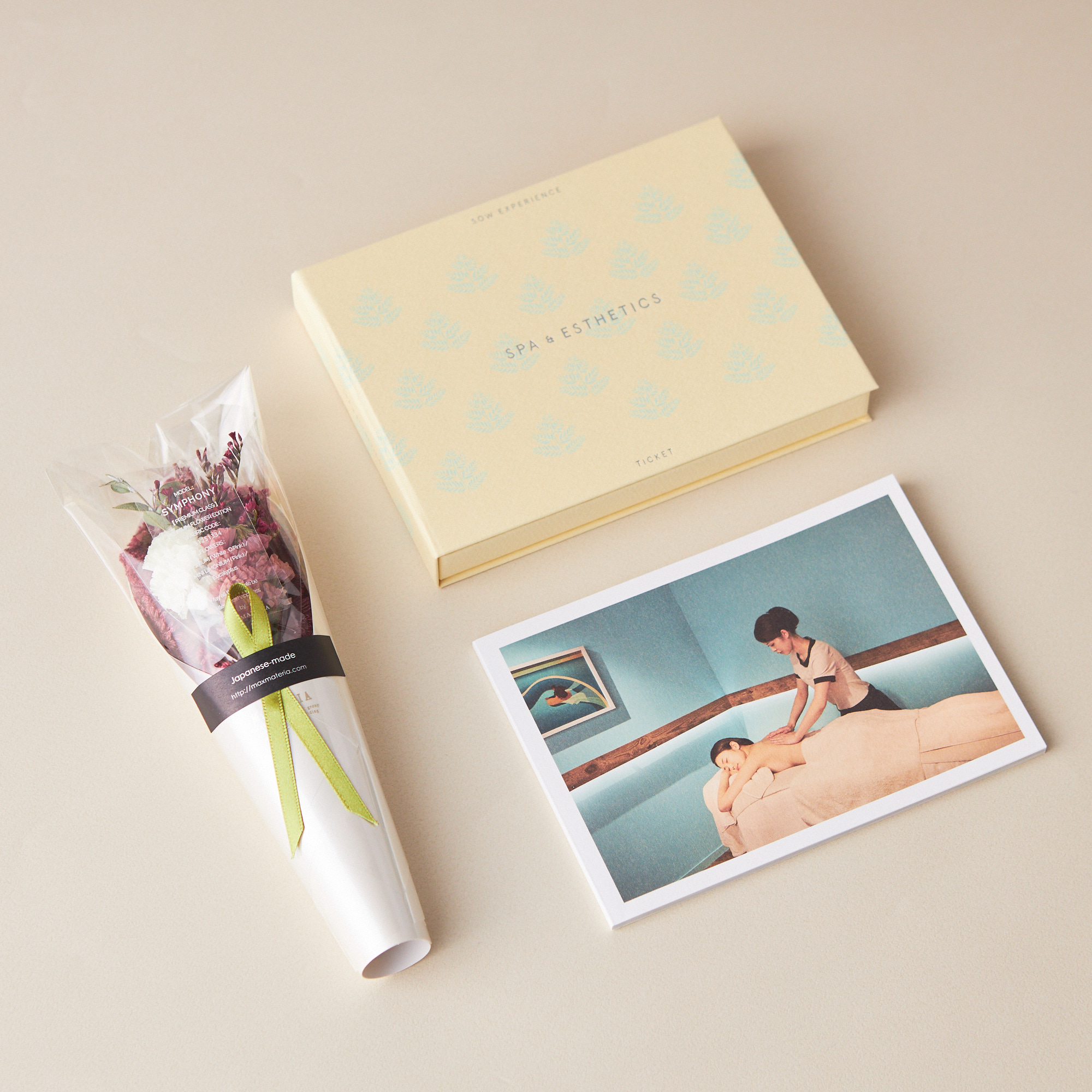 癒しの時間をプレゼントできる個室スパ・エステチケットと花束ハンドタオルのセットです。「個室スパ&エステチケット」は、「東京・神奈川・長野」で人気のサロンのスパ・エステ体験ができます。忙しい日常から少し離れて、大都市にいながら自分を大切にする、ゆったりと流れる時間を過ごしませんか。