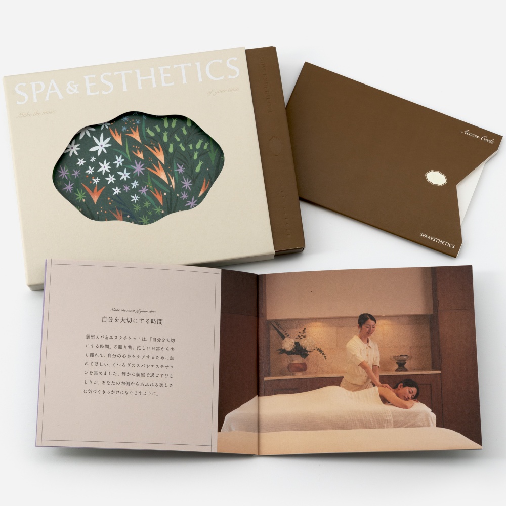 各サロンの特徴を紹介する冊子を同梱。心に染み入るやさしいデザインで、パッケージを開けた瞬間から癒やしの体験が始まります。