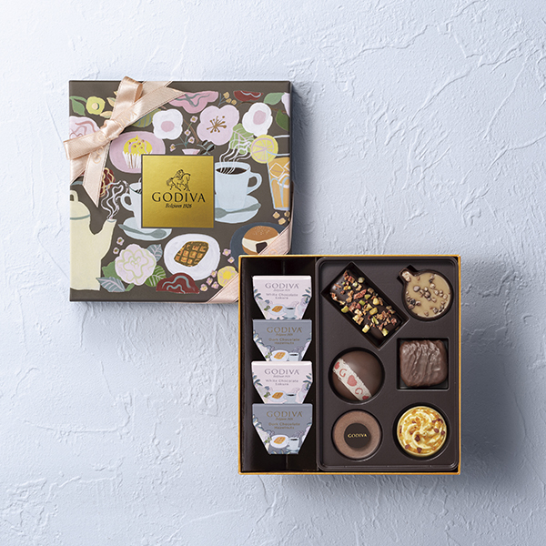 世界で愛されるチョコレートブランド「GODIVA(ゴディバ)」 のカフェ アソートメント。ティーカップ、フラワー、マリトッツォなど、カフェでの幸せな時間をイメージした落ち着きのあるパッケージに、限定カレや限定チョコレートなどを詰め合わせました。