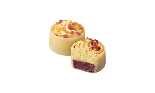 ラズベリーとブルーベリーがベースのガナッシュに、サクサクとしたクッキークランブルが入った渦巻き状のエルダーフラワー風味のムースを重ね、ホワイトチョコレートのカップで包み、クリスピーで色鮮やかなキャラメルとブルーベリーキャンディーで飾りました。ラズベリー&ブルーベリーガナッシュのさわやかな酸味とホワイトチョコレートの優しい甘さがみごとに調和した味わい。