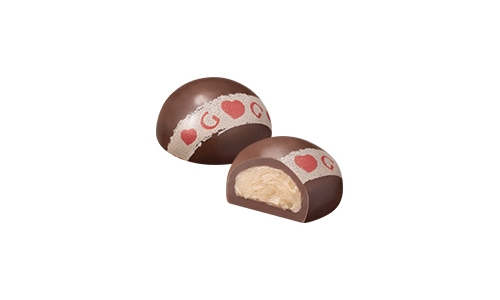 なめらかな口当たりのヘーゼルナッツプラリネムースを半球形のミルクチョコレートで包み、ハートとGのデザインを描きました。口の中でほどけていくような優しい甘さが癒しをくれる、マリトッツォをイメージしたひと粒。
