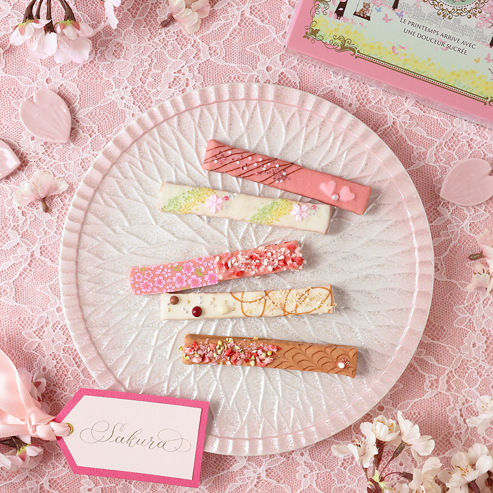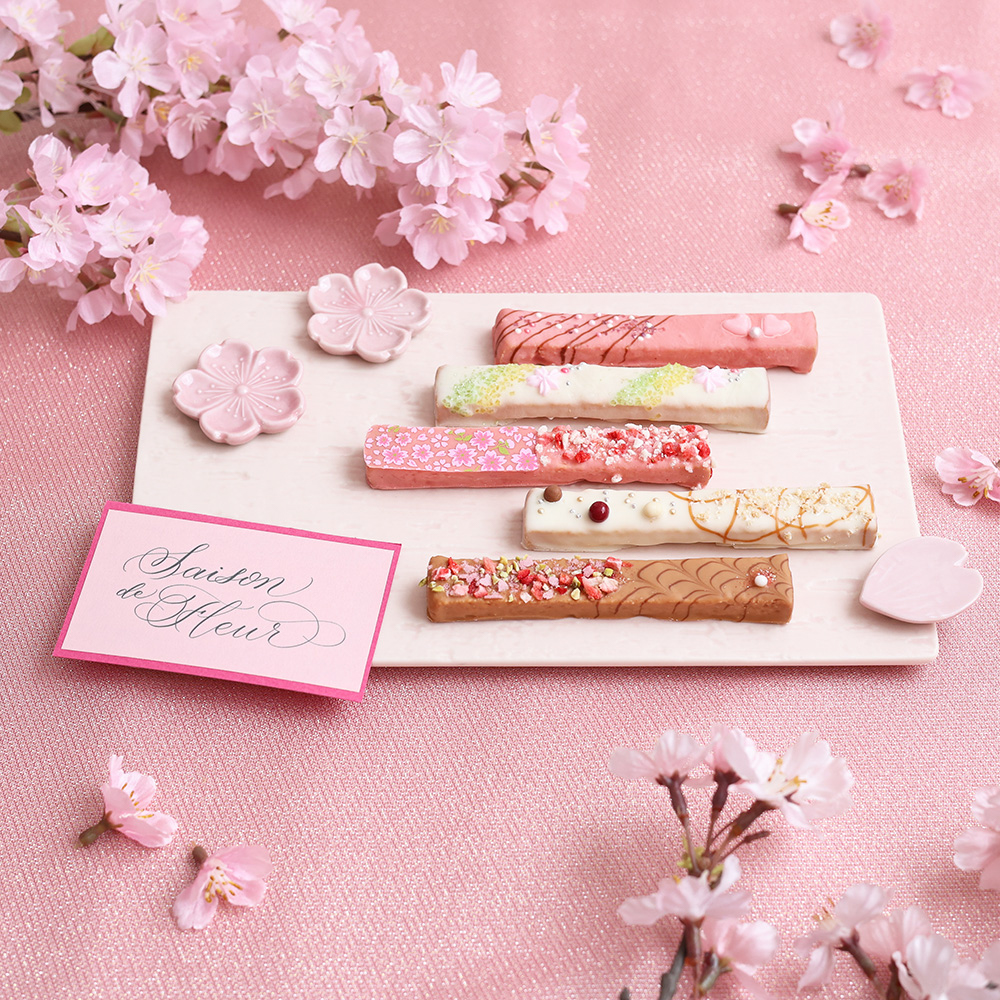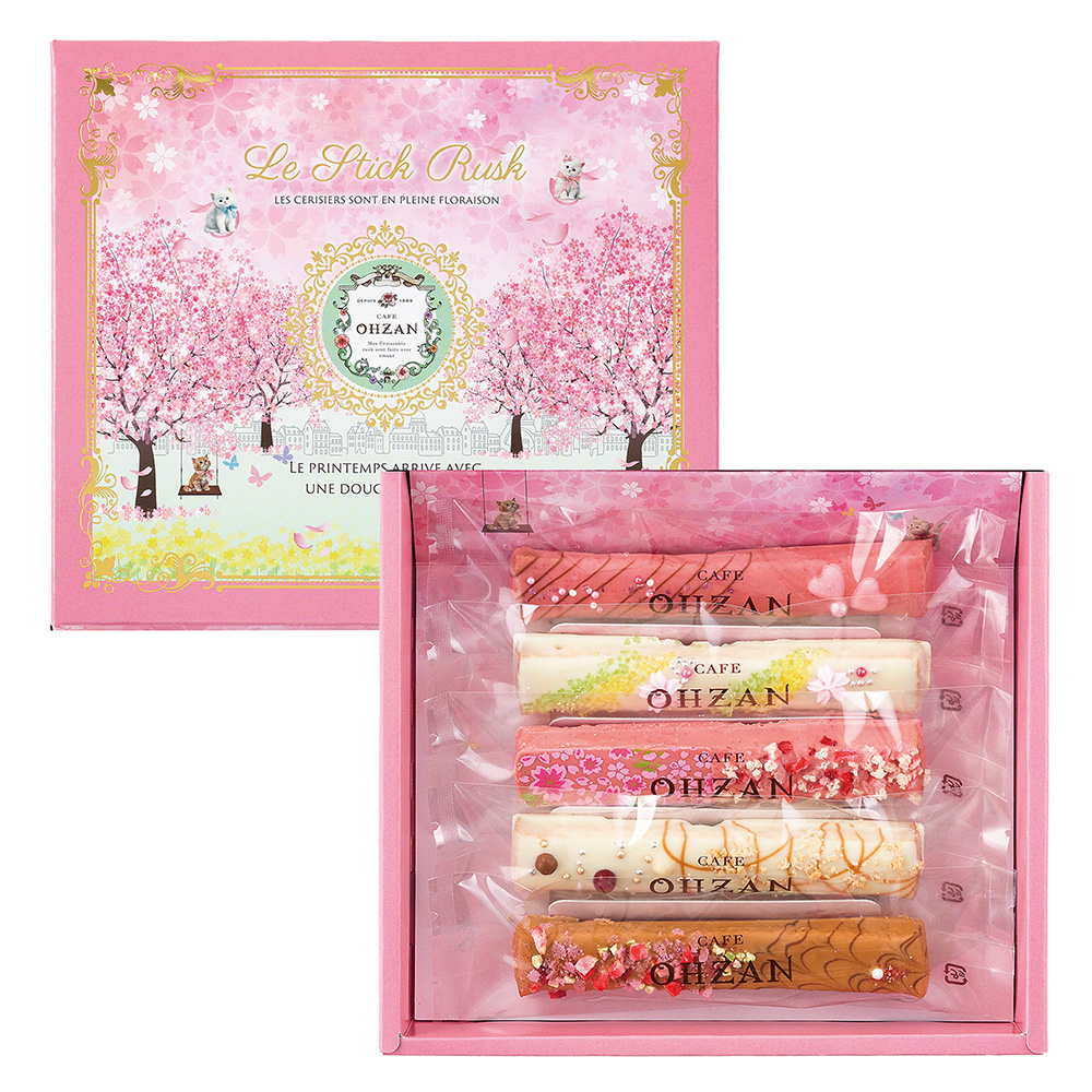 「CAFE OHZAN(カフェ オウザン)」から数量限定・桜デザインの「セゾンデフルール」コレクションが登場。ピンクの華やかなパッケージでお届けします。チョコレートをコーティングした生地に華やかにデコレーションをした、サクラ色のまるで宝石のようなスティックラスク。大人可愛いデザインのパッケージで温かい想いを伝える特別な贈り物を。