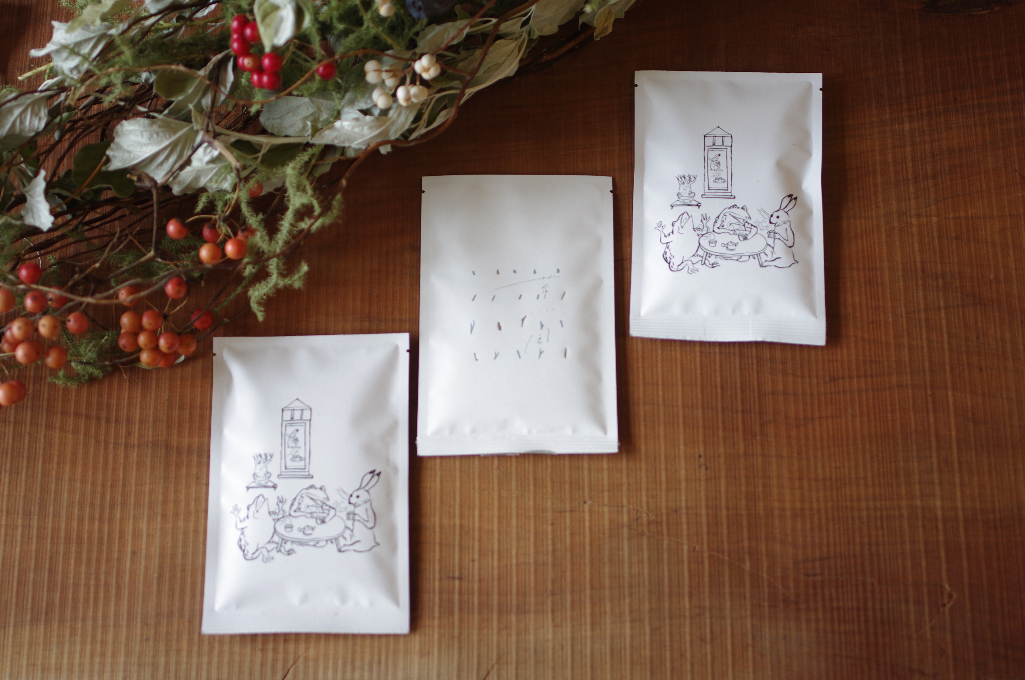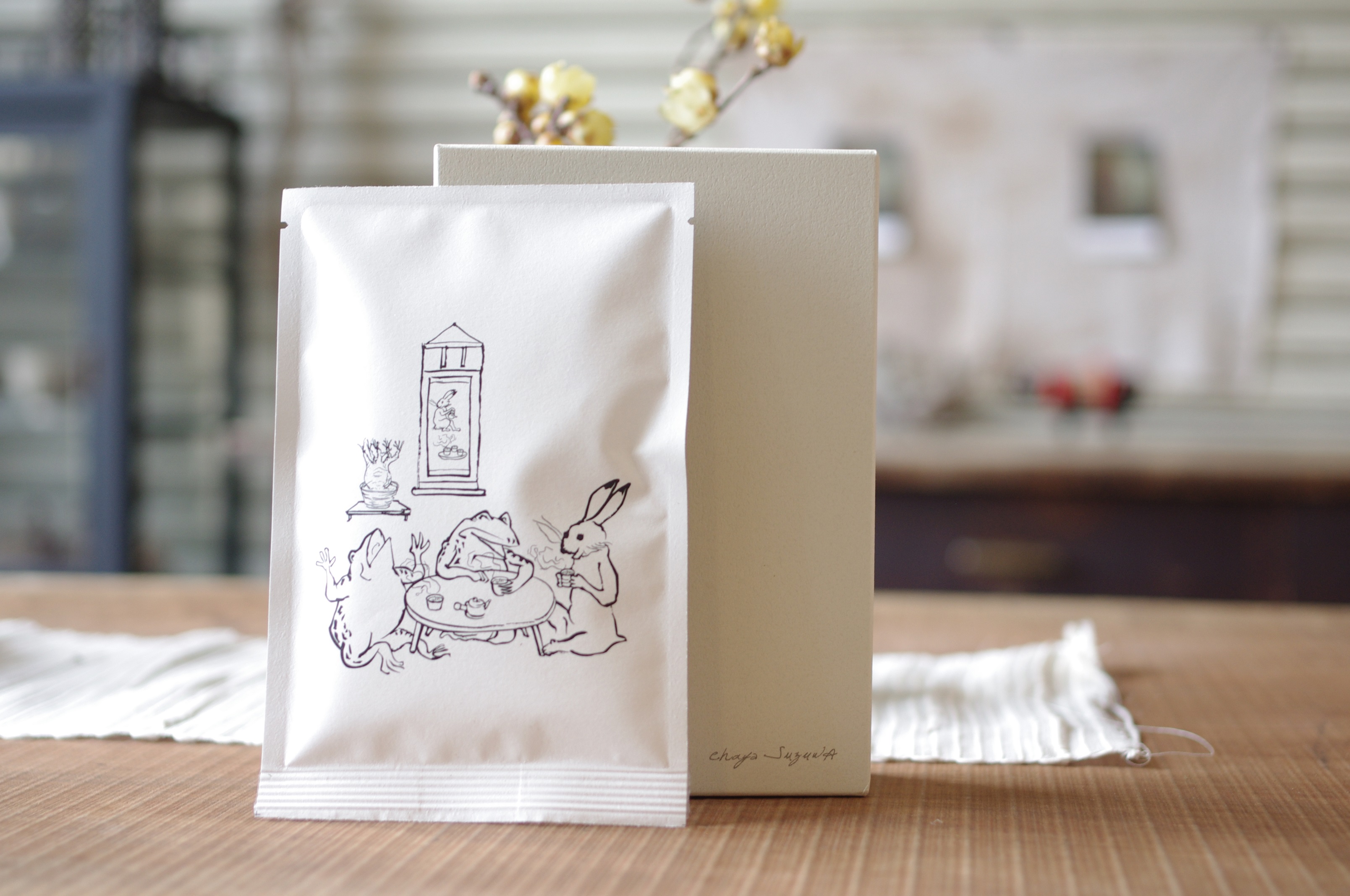 お茶問屋の技術に合組という産地や品種の異なる茶葉をブレンドする伝統技術があります。この技術でひとつの産地だけからでは味わうことができない味、そして色や香り、余韻の長さが特徴の当店独自のお茶を作っております。 かしこまったレストランで食べる料理も美味しいけど山で食べるおにぎりも美味しい。誰と飲むか、どこで飲むか、どう楽しむか。お茶の醍醐味は味や香りはもちろんですがその時間だと常々考えてます。 そんな楽しみを感じていただけるよう何杯飲んでも飽きがこない。いつの間にか誰かといつも飲んでる。そのようなイメージで合組(ブレンド)しました。 昔はよく見たお茶の間の光景を日本最古のアニメーション鳥獣戯画で富士にあるサンキューデザインさんにデザインしていただきました。床の間には花の代わりに大好きな植物グラキリスを飾り、お茶を飲む方々には縁起の良い茶柱が立っております。 日本中に、いや世界中に団欒が広がりこのような景色が見れますように。 そんな想いを込めて名を【団欒】とつけました。