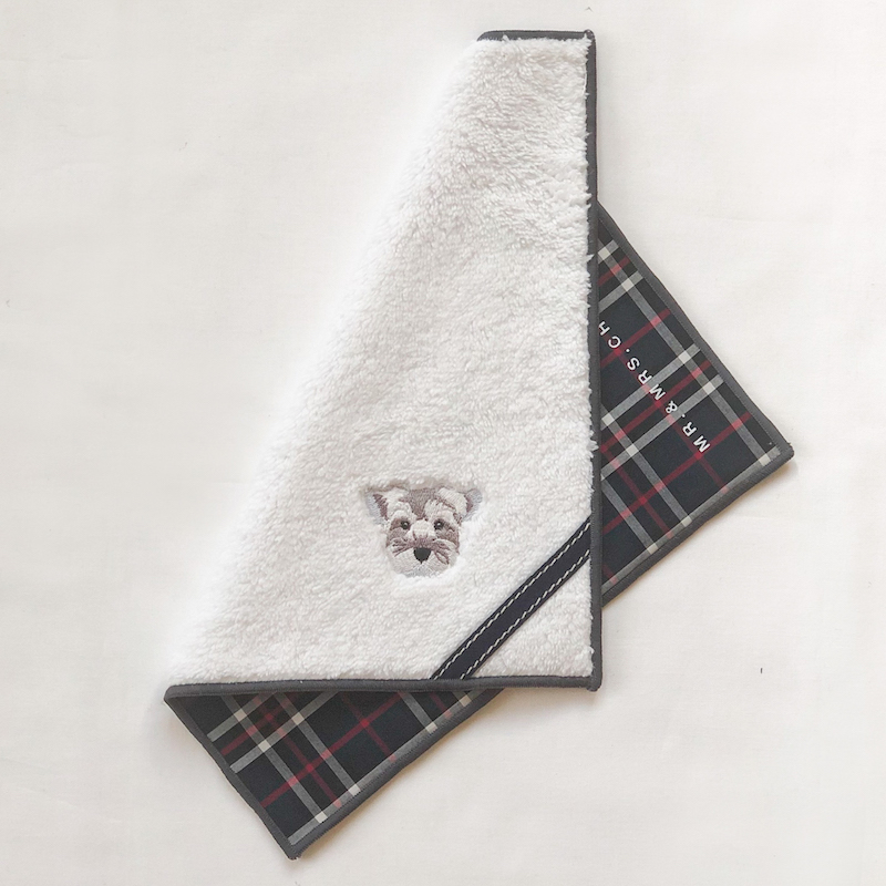 表はオリジナルのマイクロファイバーボアにワンちゃんの刺繍が映えます。 裏は浜松や播州の先染めの生地になっています。 タータンチェックやストライプなど、ボアと柄のありそうでなかった組み合わせです。