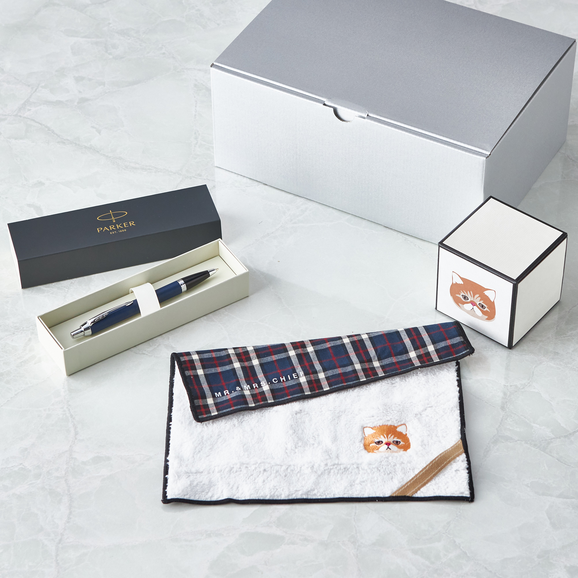 大口注文・法人のお問い合わせはこちら英国王室御用達の高級筆記具ブランド「PARKER(パーカー)」がお届けするボールペン「パーカー・IM」とフォーマルにも使えるハンカチブランド「MR.&MRS .CHIEF」のネコのモチーフがかわいらしいタオルハンカチセットがタンプ限定で登場! ●セット内容 ・名入れ付きボールペン 1点 ・タオルハンカチ 1点 商品をシルバーのボックスに入れ、そのボックスを段ボールに入れてお届けします。
