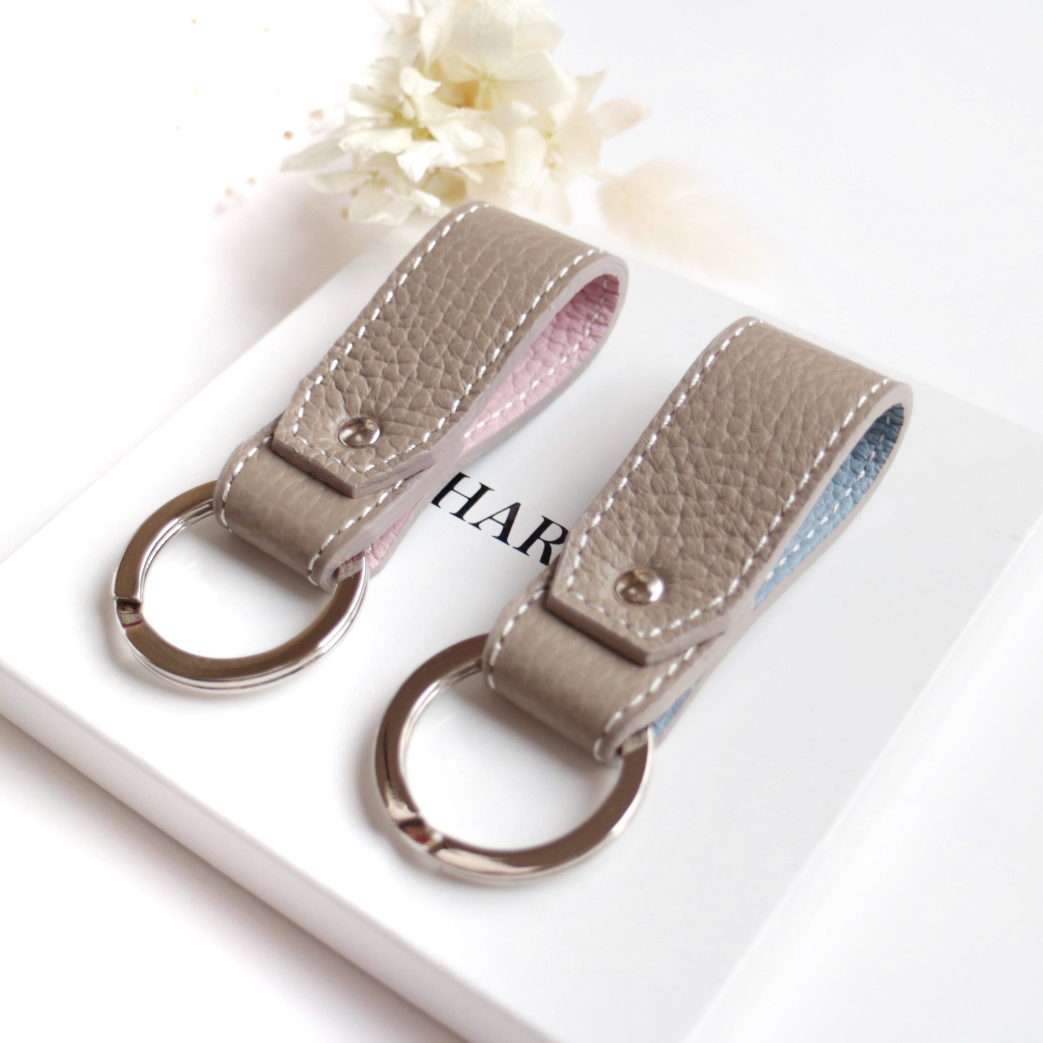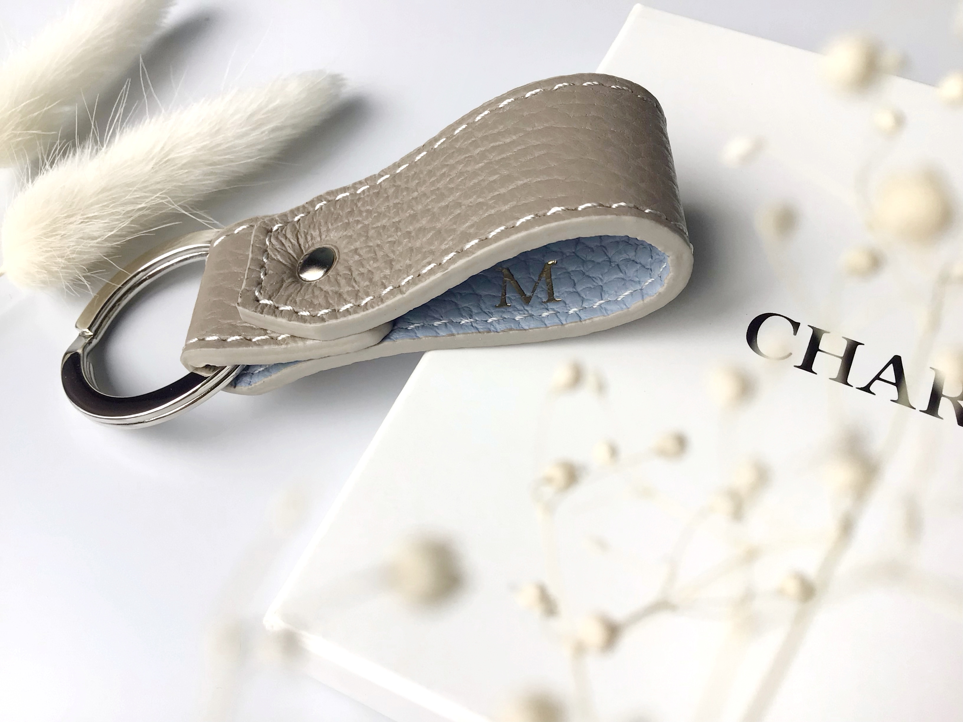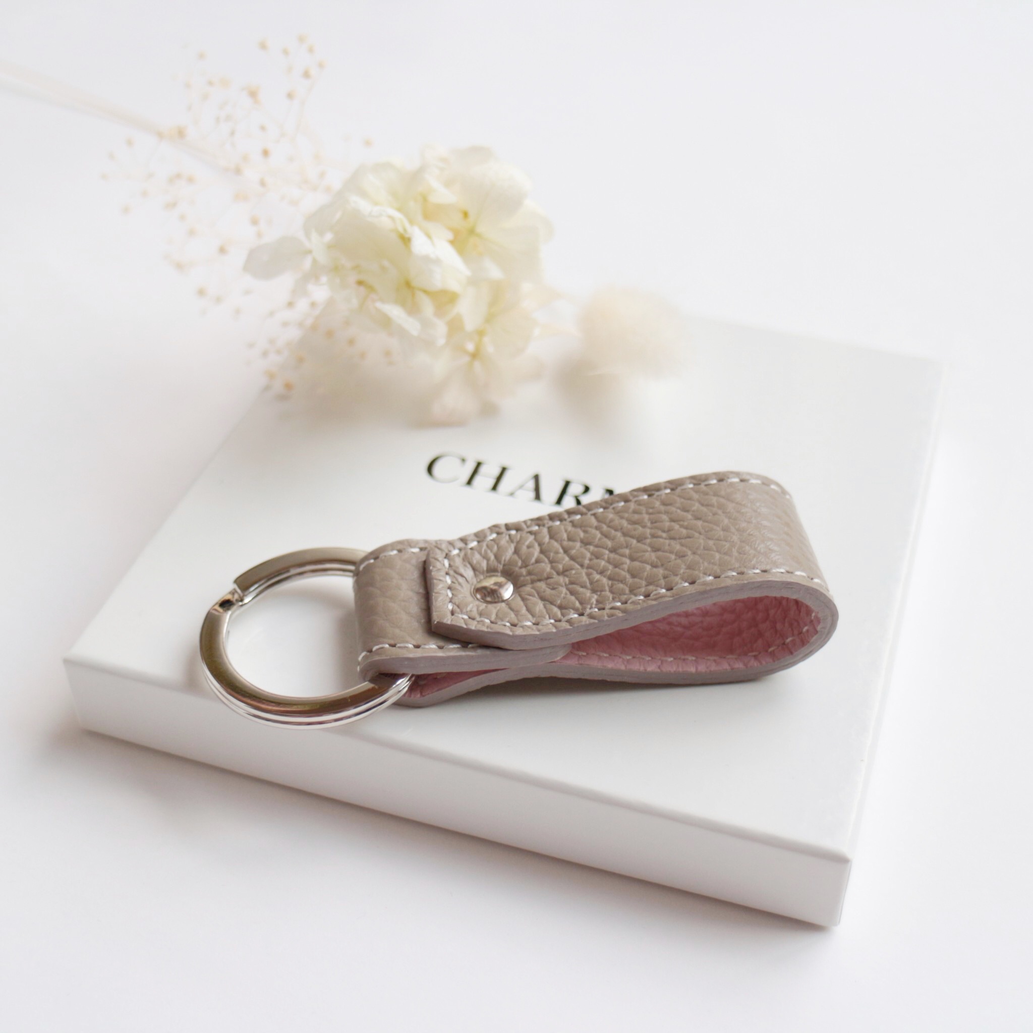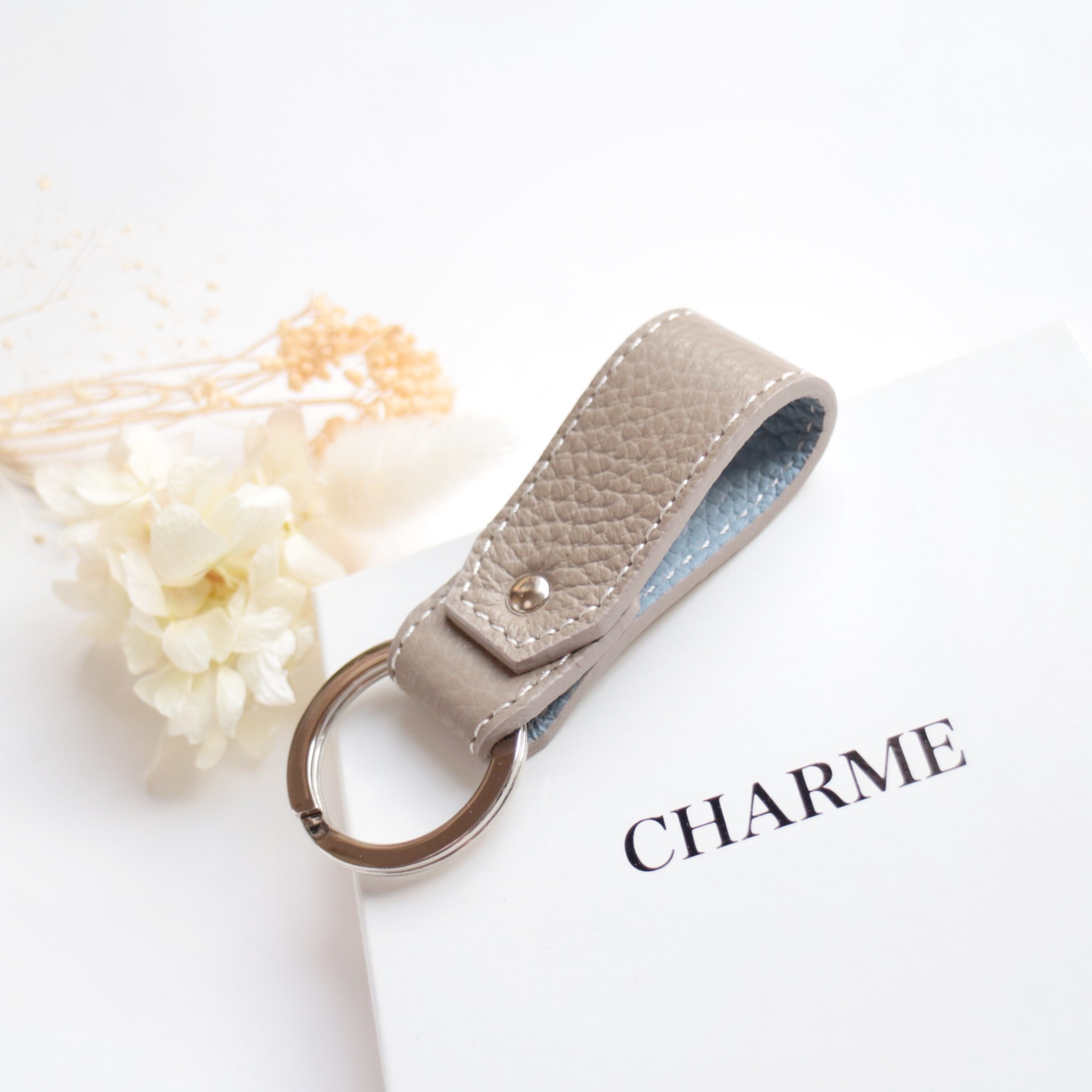 上質な本革を使用した「Charme(シャルム)」のループキーリング。シンプルながらも細部のラインシェイプにこだわってデザインしています。 両面革張りのバイカラーがおしゃれ!本革でシンプルなデザインのため長くお使いいただけます。3色ご用意しております。また、有料でイニシャル刻印が可能です。