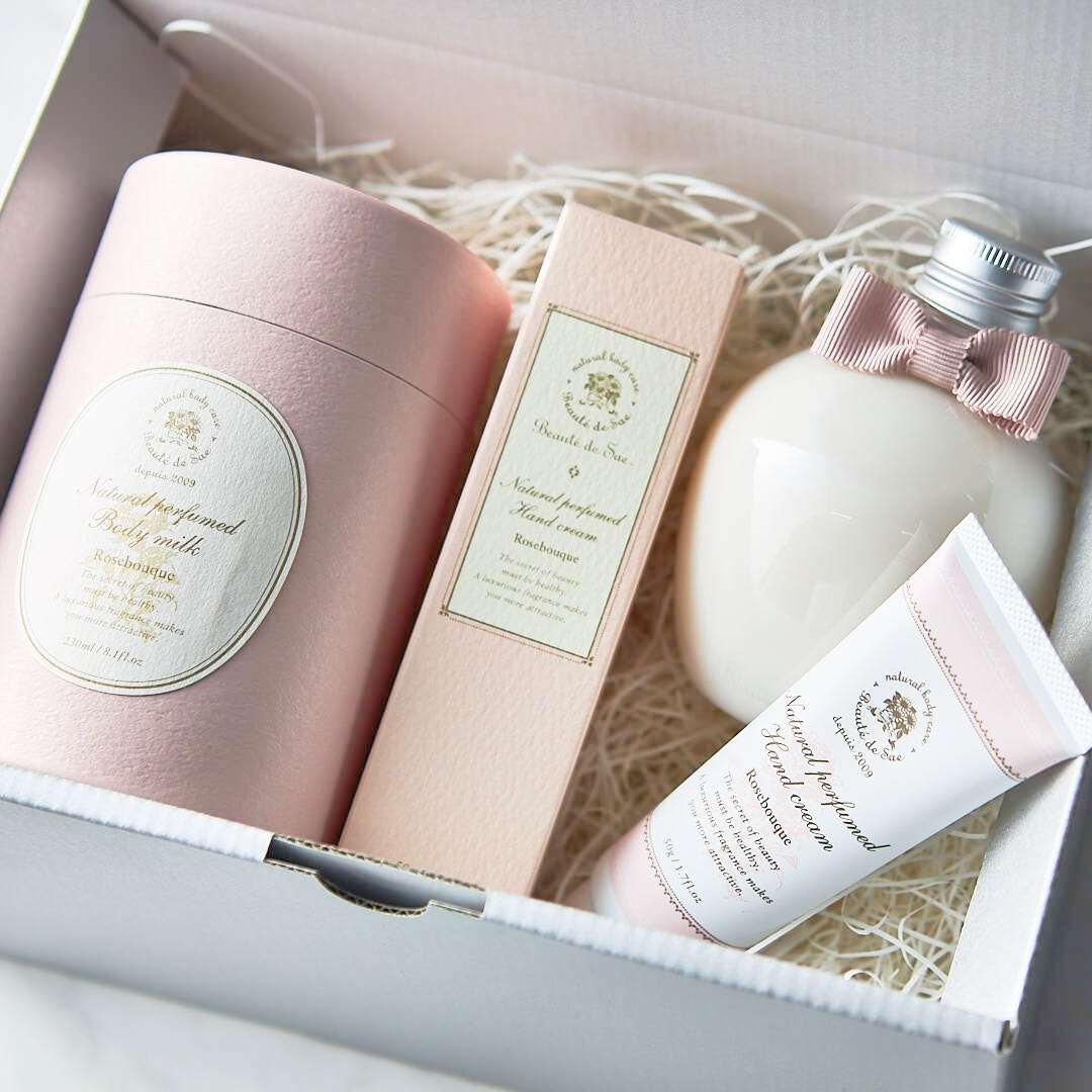 フレグランス ボディケアブランド「Beaute de Sae(ボーテ デュ サエ)」のハンドクリームと、ボディミルクをセットでお届け。それぞれ良質な保湿成分を配合。みずみずしい潤い肌へ導いてくれます。おしゃれなBOXに入っているので、そのままお相手にお渡しいただけます。