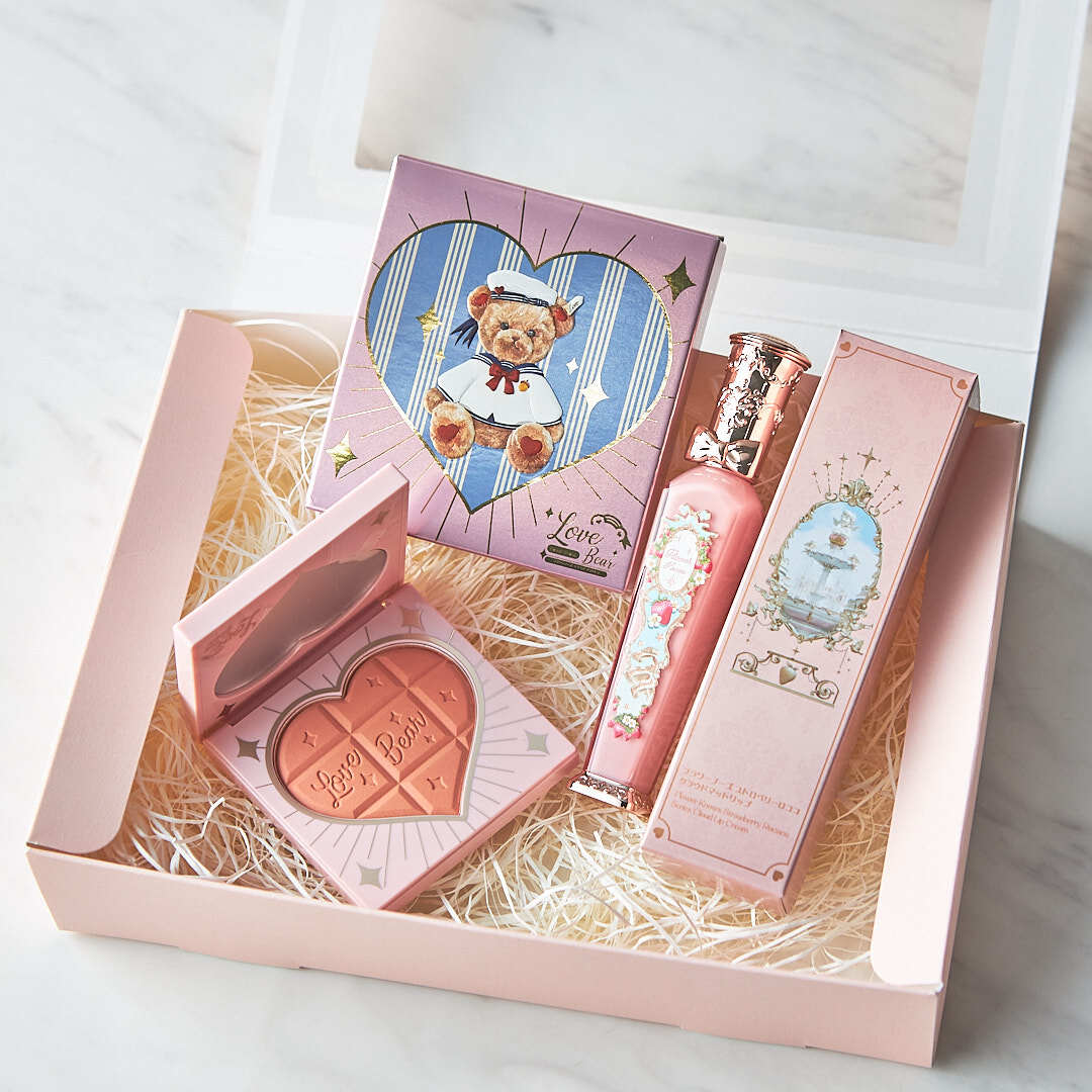 「フラワーノーズ」の、可愛らしいベア柄チークブラッシュと、まるで香水瓶のようなおしゃれなパッケージのクラウドマットリップをセットでお届け。おしゃれなBOXに入っているので、そのままお相手にお渡しいただけます。