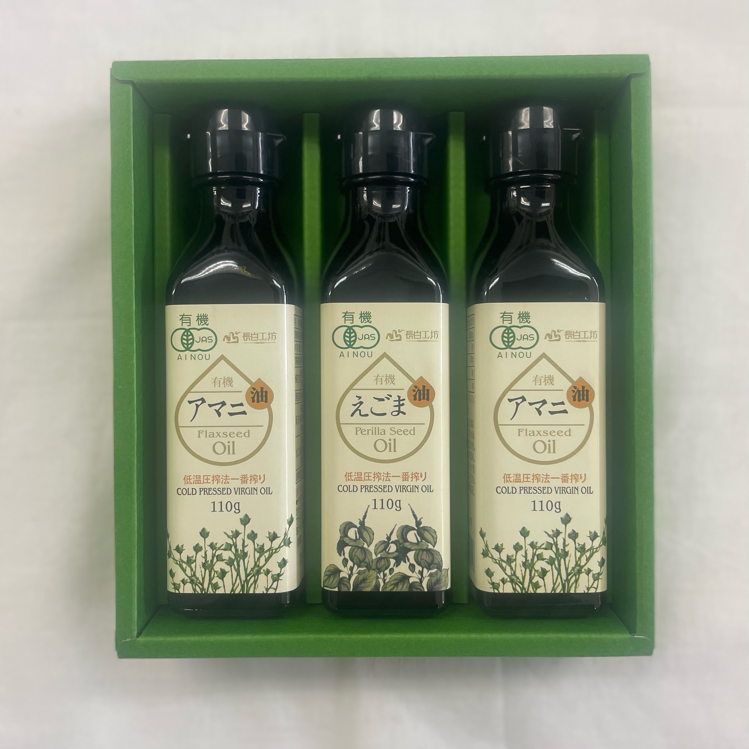 大口注文・法人のお問い合わせはこちら有機栽培されたえごま、アマニの実を厳選し、無添加、無精製で品質にこだわって作られたオーガニックオイルです。 科学物質に頼らず、自然界の力で生産された食品を表す「有機JASマーク」認証を取得しています。低温で圧搾するコールドプレス製法なので、熱で壊れやすい風味、香り、栄養成分がそのまま残っています。えごま油、アマニ油には美容面と健康面から注目を集めているオメガ3-αリノレン酸が、60%以上含まれています。 畑の青魚とも呼ばれるオメガ3オイルの3本セットで健康を贈り届けていただきたいです。 希少なオーガニックのえごま油とアマニ油が、一度に楽しめます。オメガ3必須脂肪酸は体内で作れないので、食べ物で摂らなくてはなりませんが、えごま油、アマニ油で手軽に摂ることができます。生活習慣病予防にもなるオイルのセットをぜひ、ご両親や、おじいちゃん、おばあちゃんに贈りましょう。
