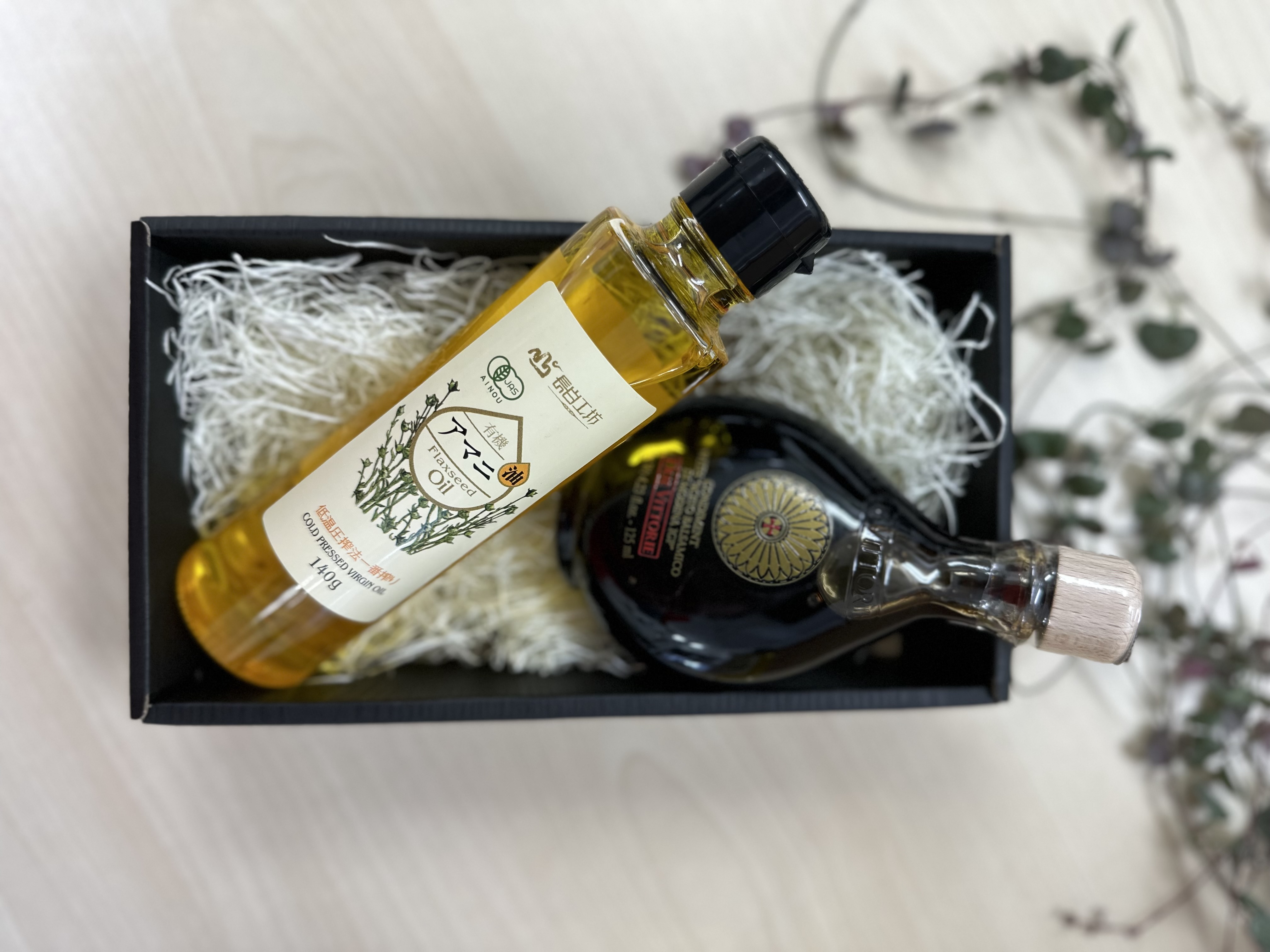 生産から製品化まで一貫して管理しているのが強みのオーガニク食用オイルブランド「長白工坊」の有機アマニオイルバルサミコ酢セット。アマニオイルと相性の良いバルサミコ酢が欲しいというお客さまのお声をうけて15年熟成したとろみのあるバルサミコ酢を探し、セットにしました。