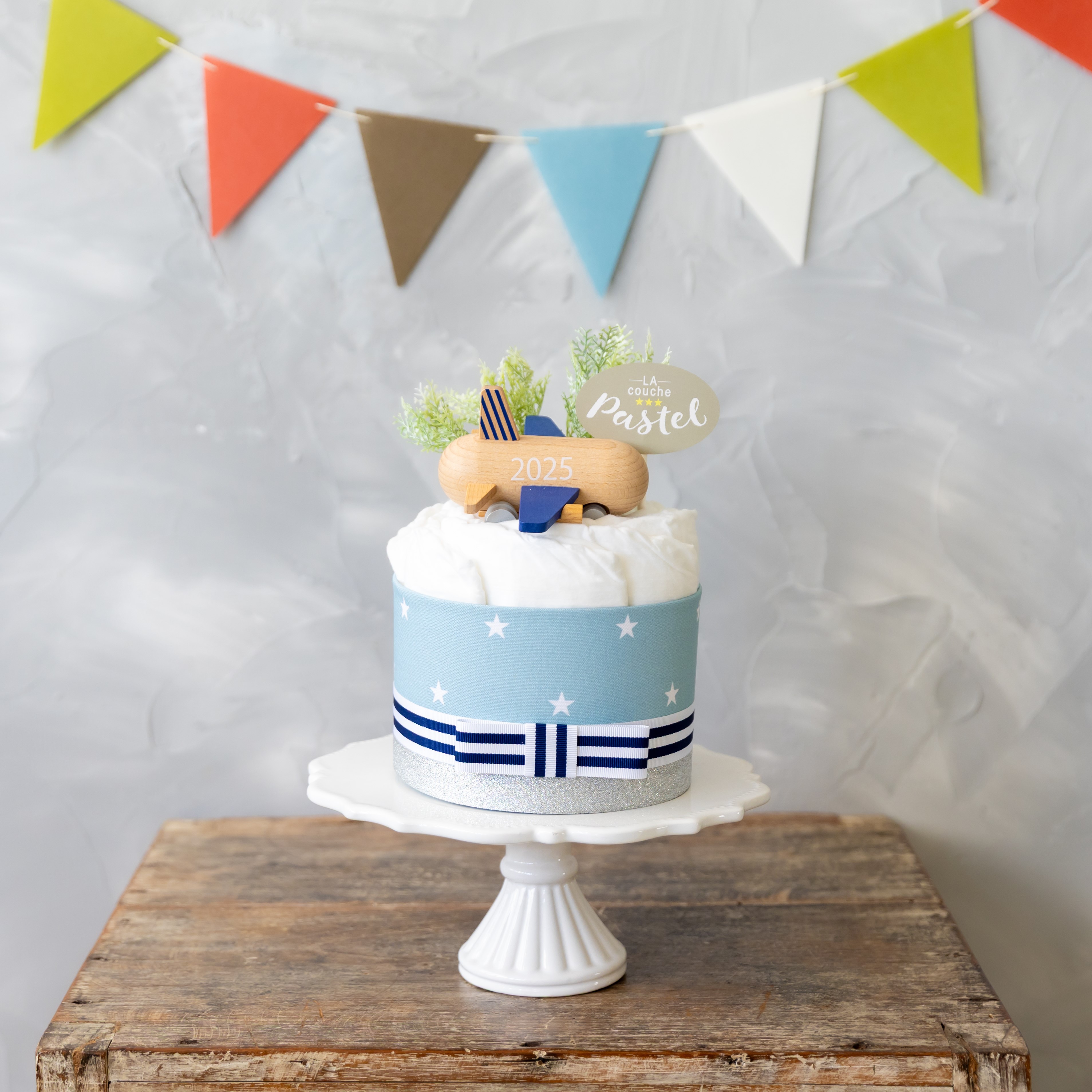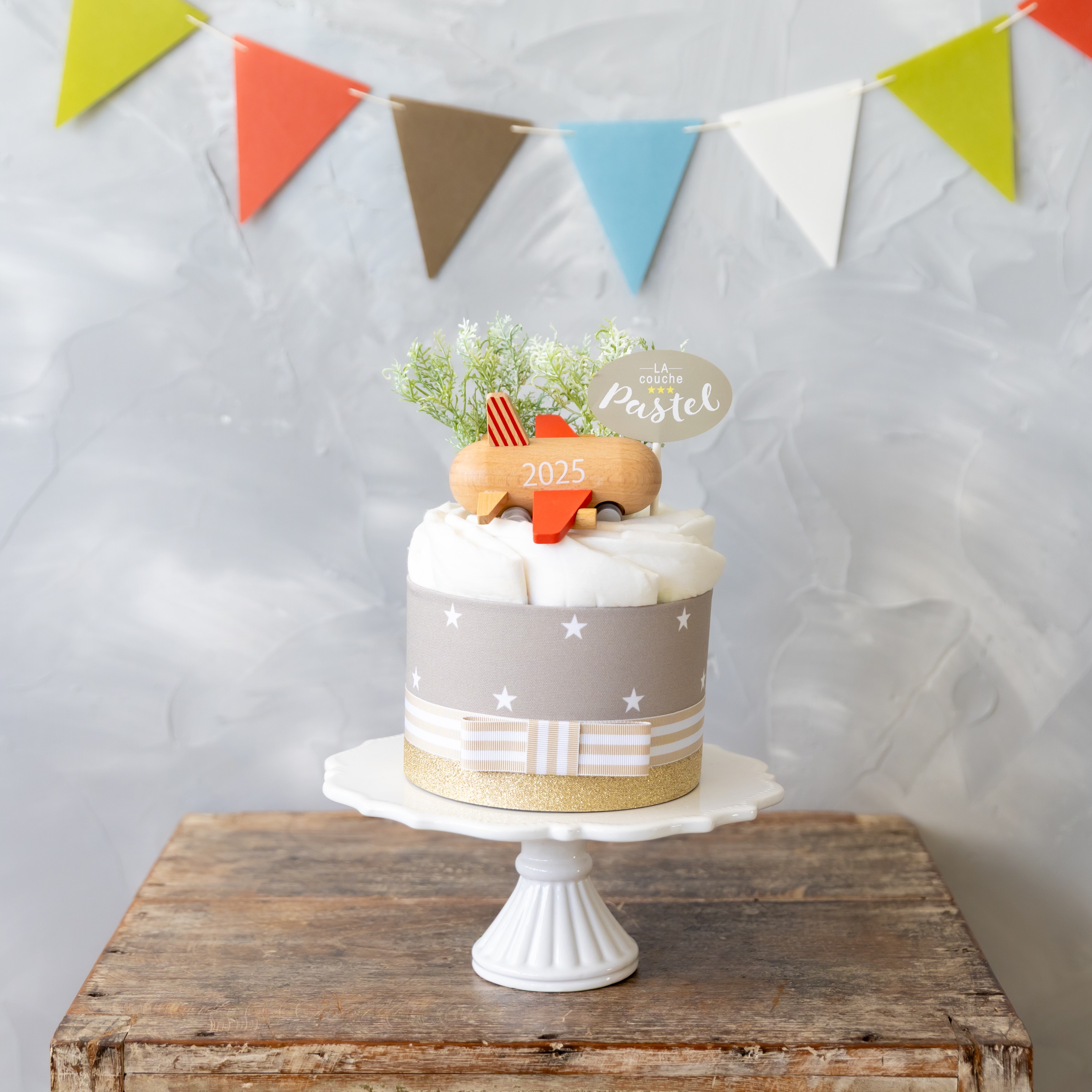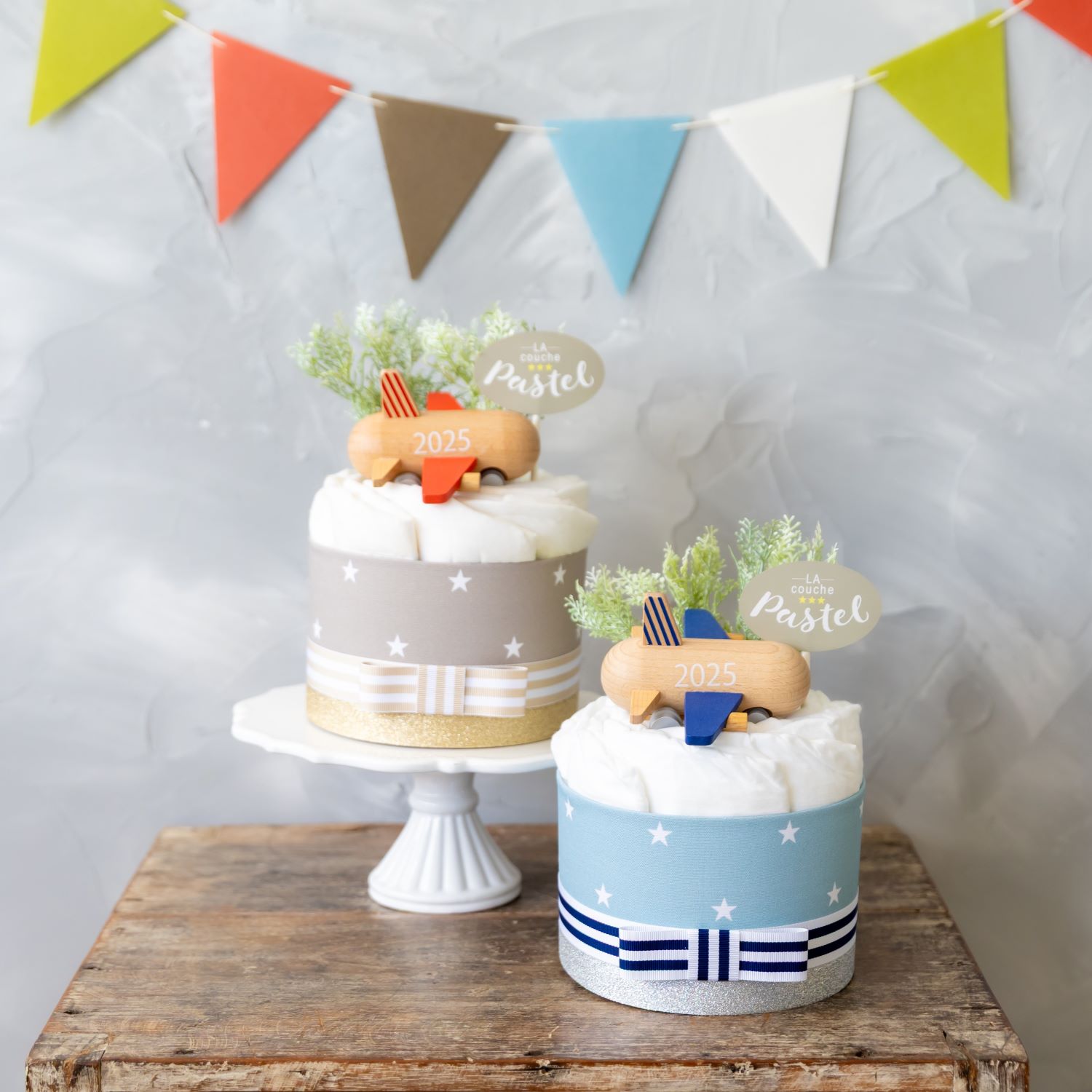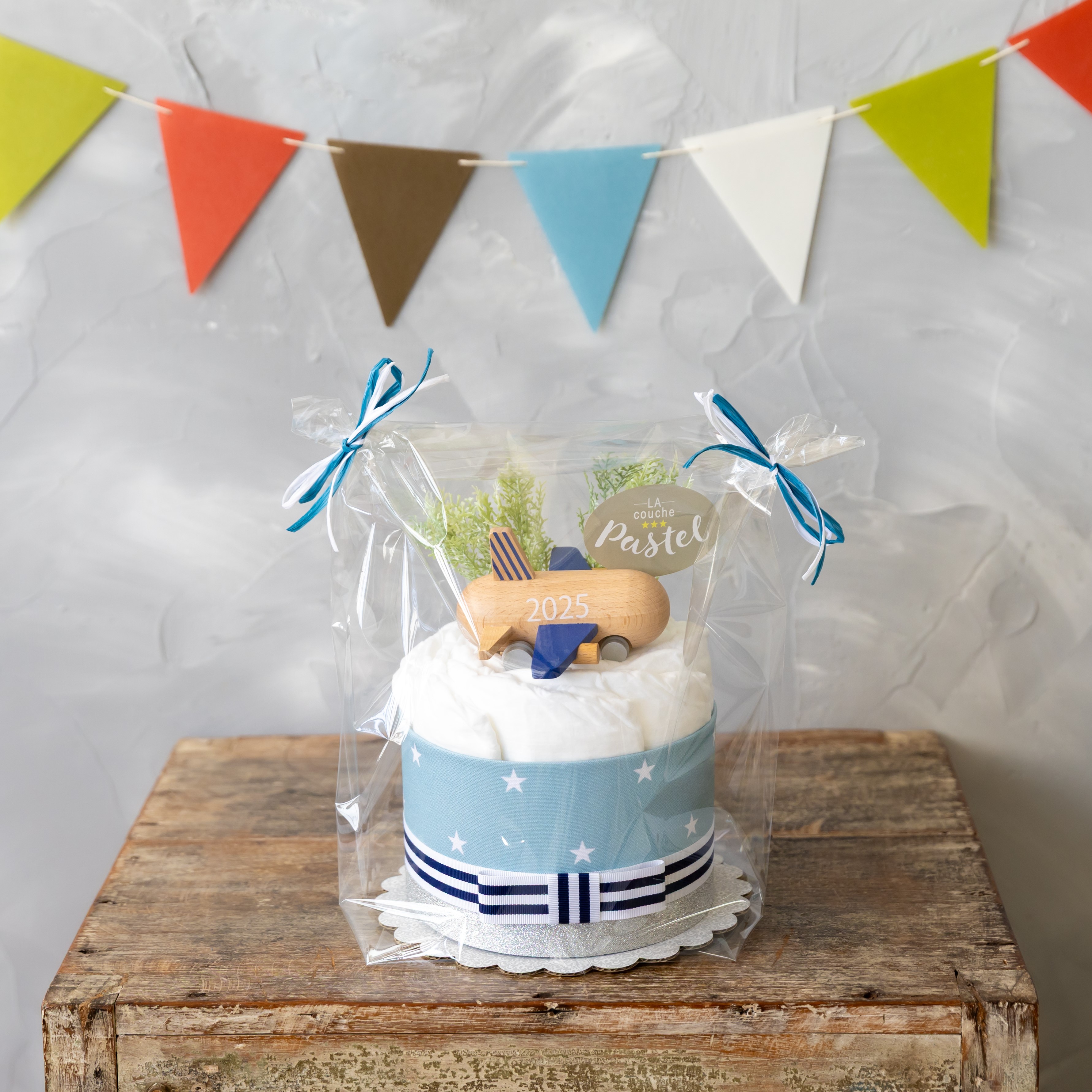 2011年にロサンゼルスのサンタモニカで誕生したおむつケーキ専門店の「おむつケーキ1段」と木のおもちゃをプロデュースするブランド【Kiko+(キコ)】のおもちゃ「mini jet」がセットになったダイパーケーキです。2025年生まれのお子様へのギフトや、記念にも最適です。