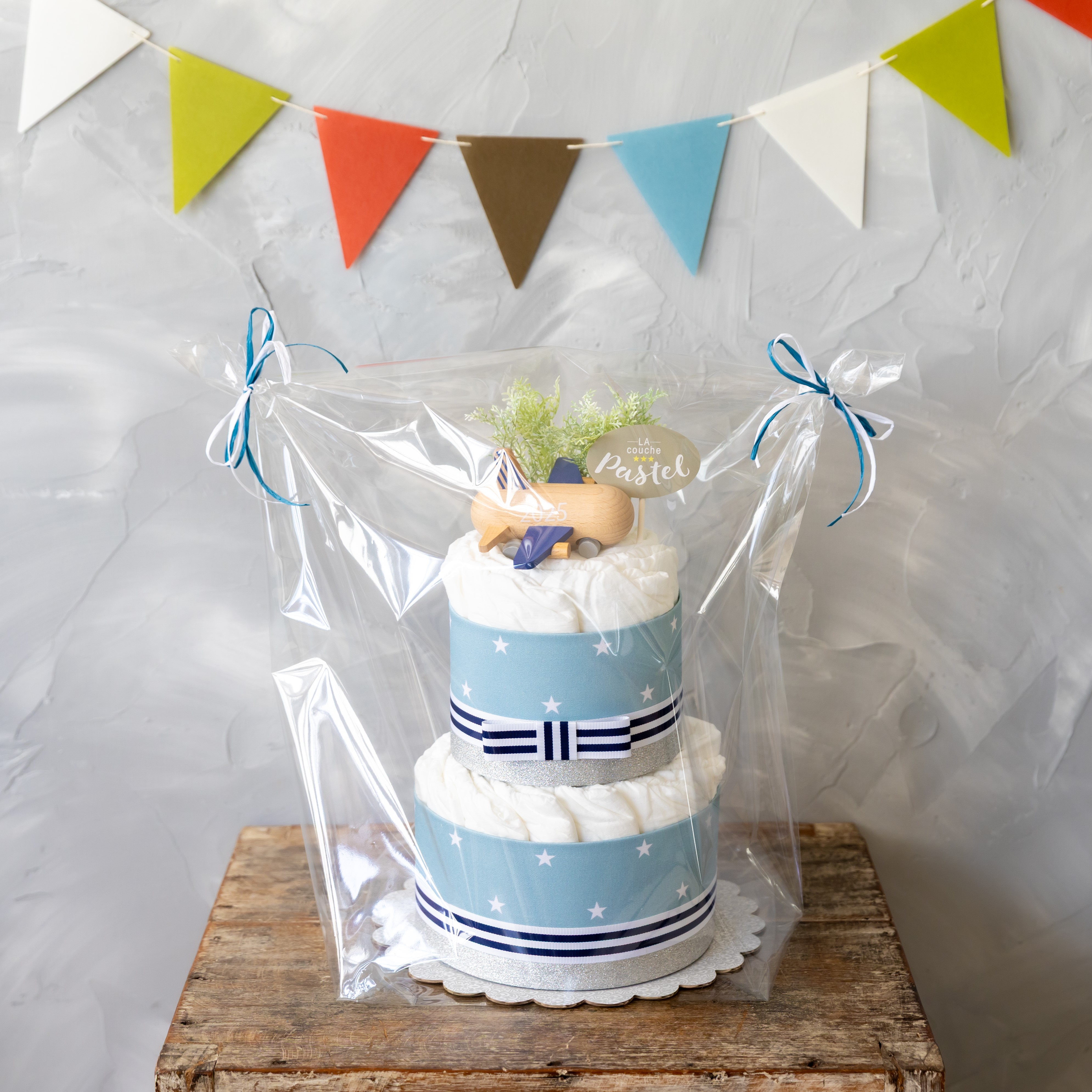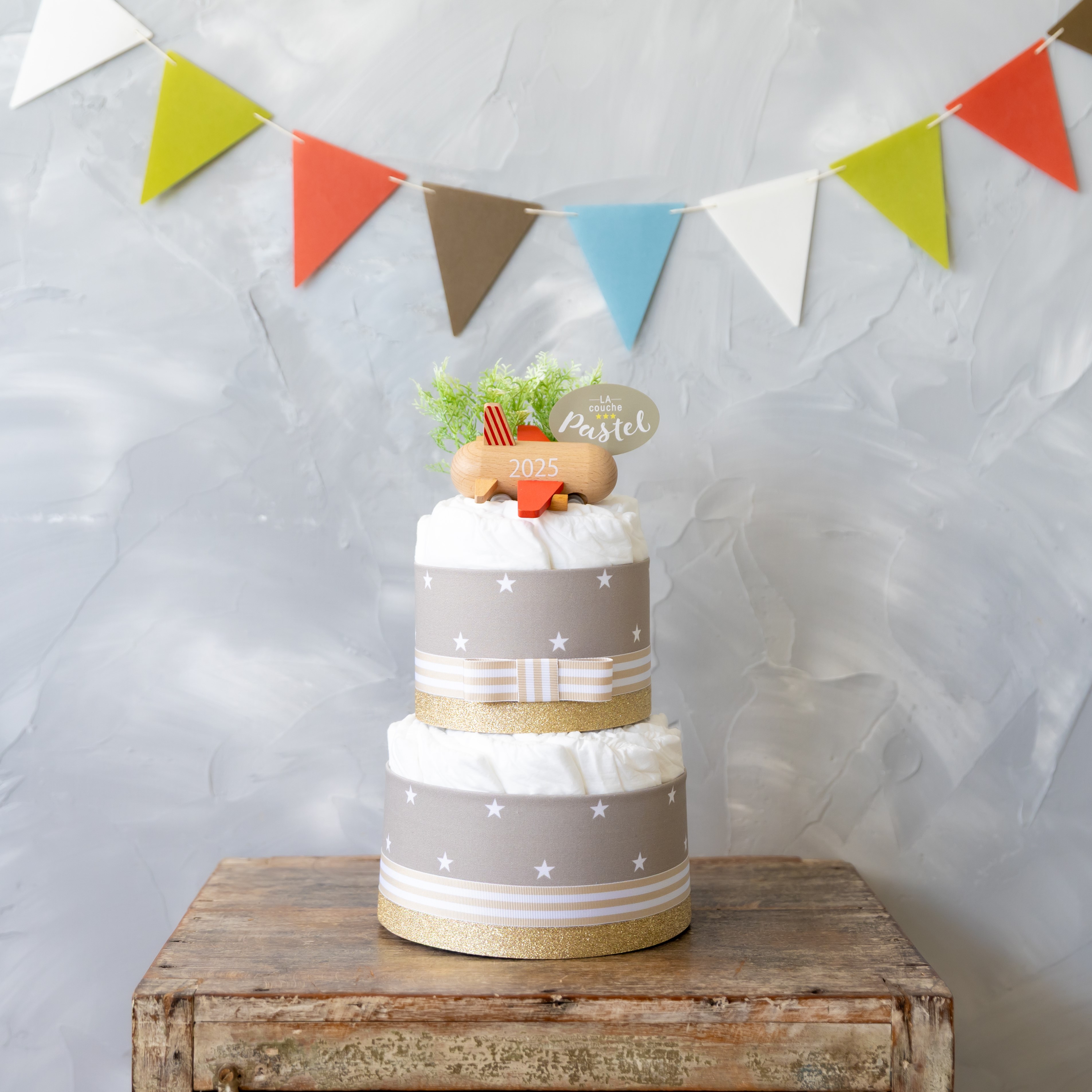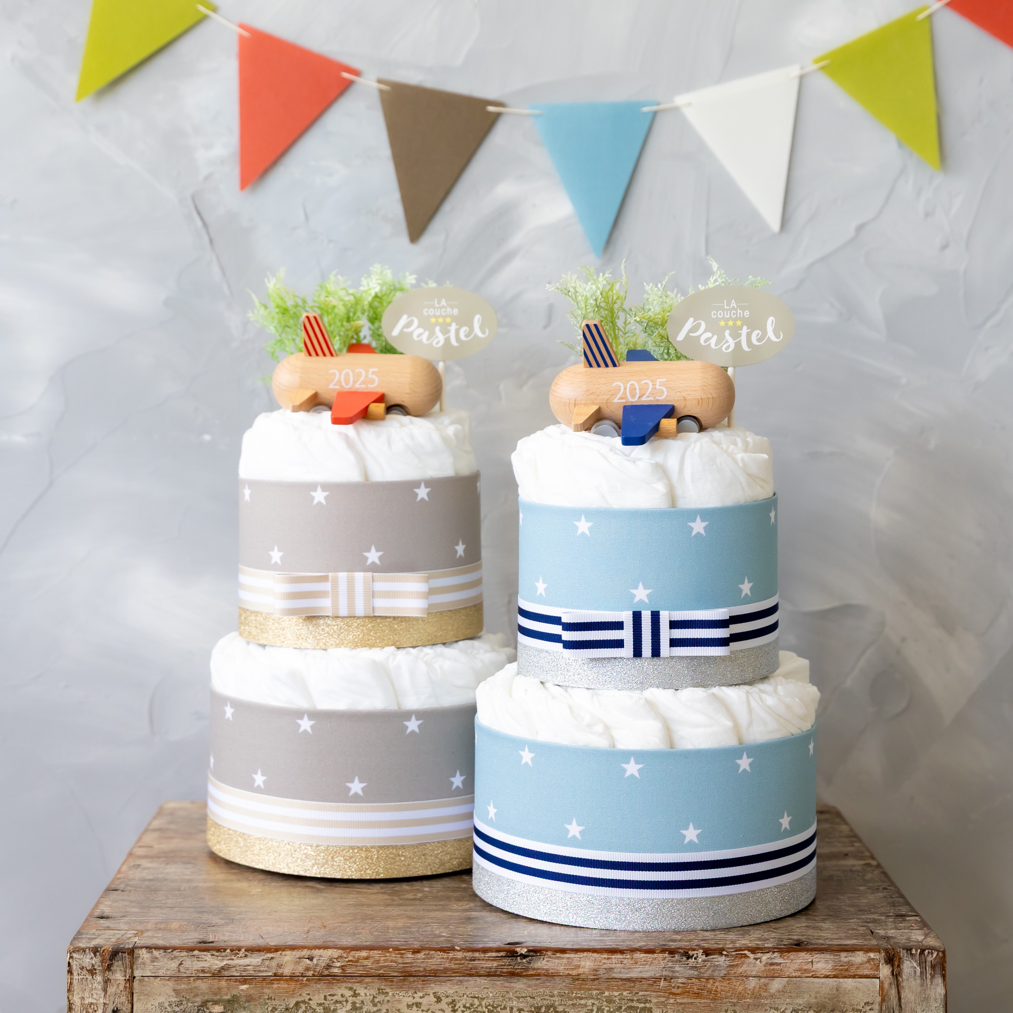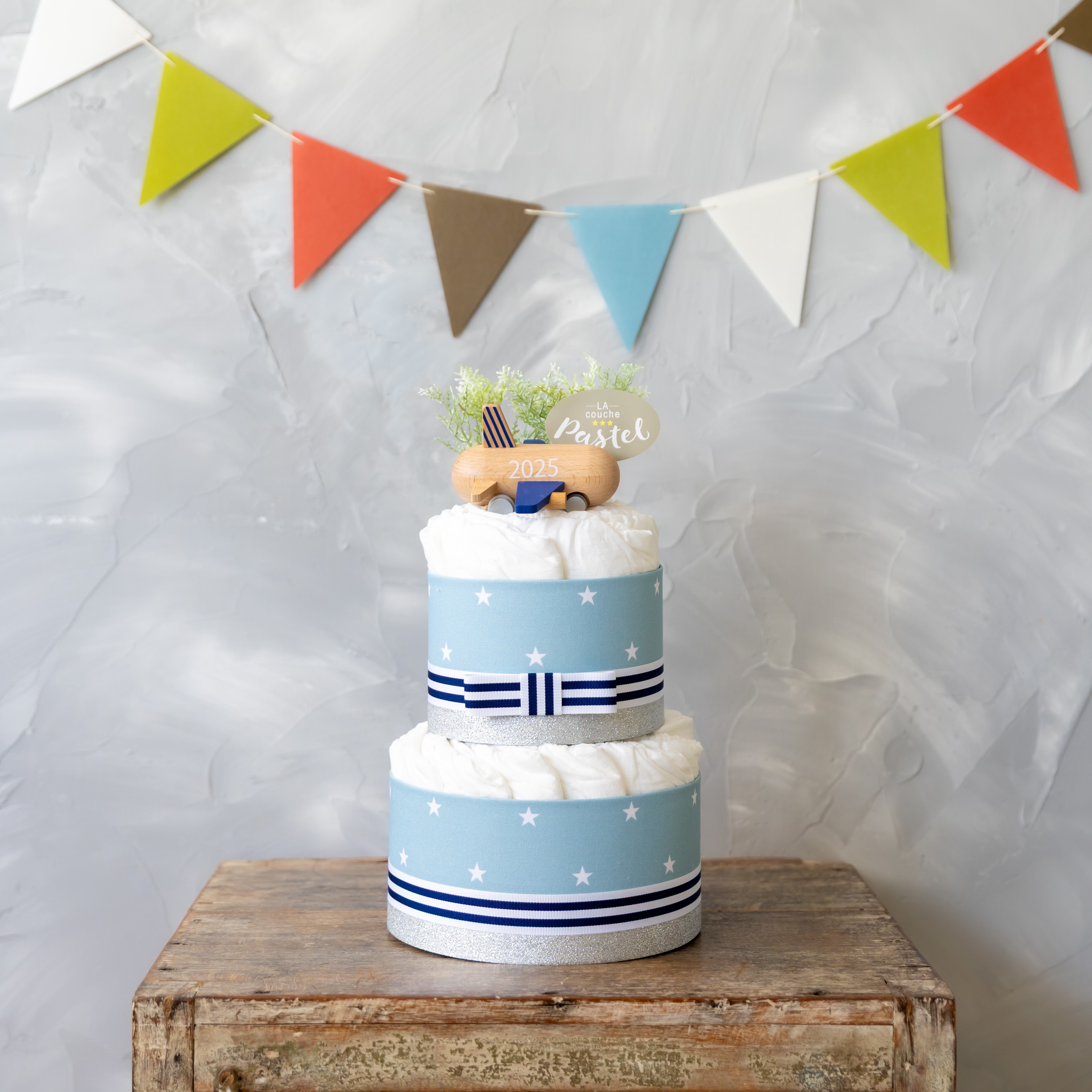 2011年にロサンゼルスのサンタモニカで誕生したおむつケーキ専門店の「おむつケーキ2段」と木のおもちゃをプロデュースするブランド【Kiko+(キコ)】のおもちゃ「mini jet」がセットになったダイパーケーキです。2024年生まれのお子様へのギフトや、記念にも最適です。