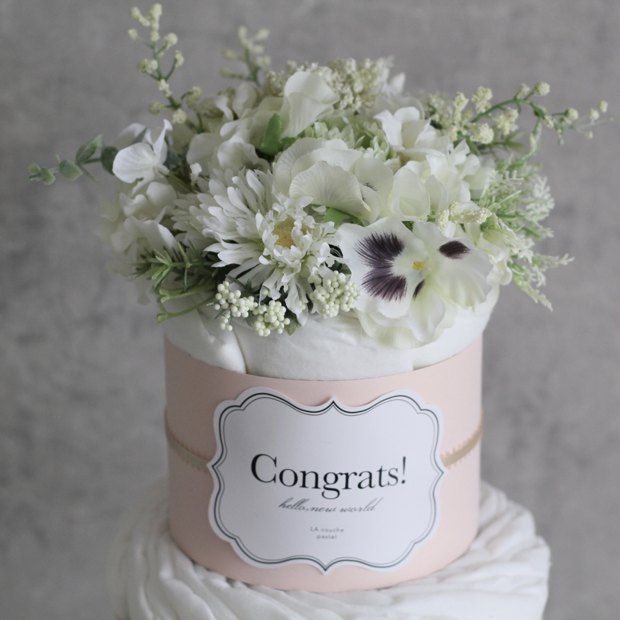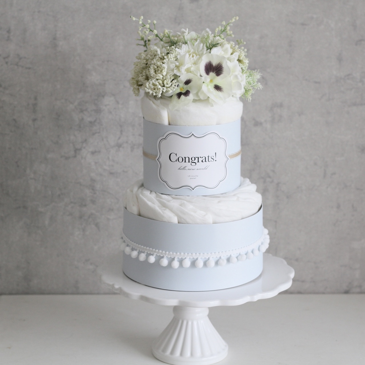 2011年にロサンゼルスのサンタモニカで誕生したおむつケーキ専門店の「おむつケーキ」と、ママへ「お疲れ様」の優しさを贈る「Fresh Bouquet」の花束がセットになったダイパーケーキです。ケーキのトップのお花はインテリアとしても飾っていただけます。