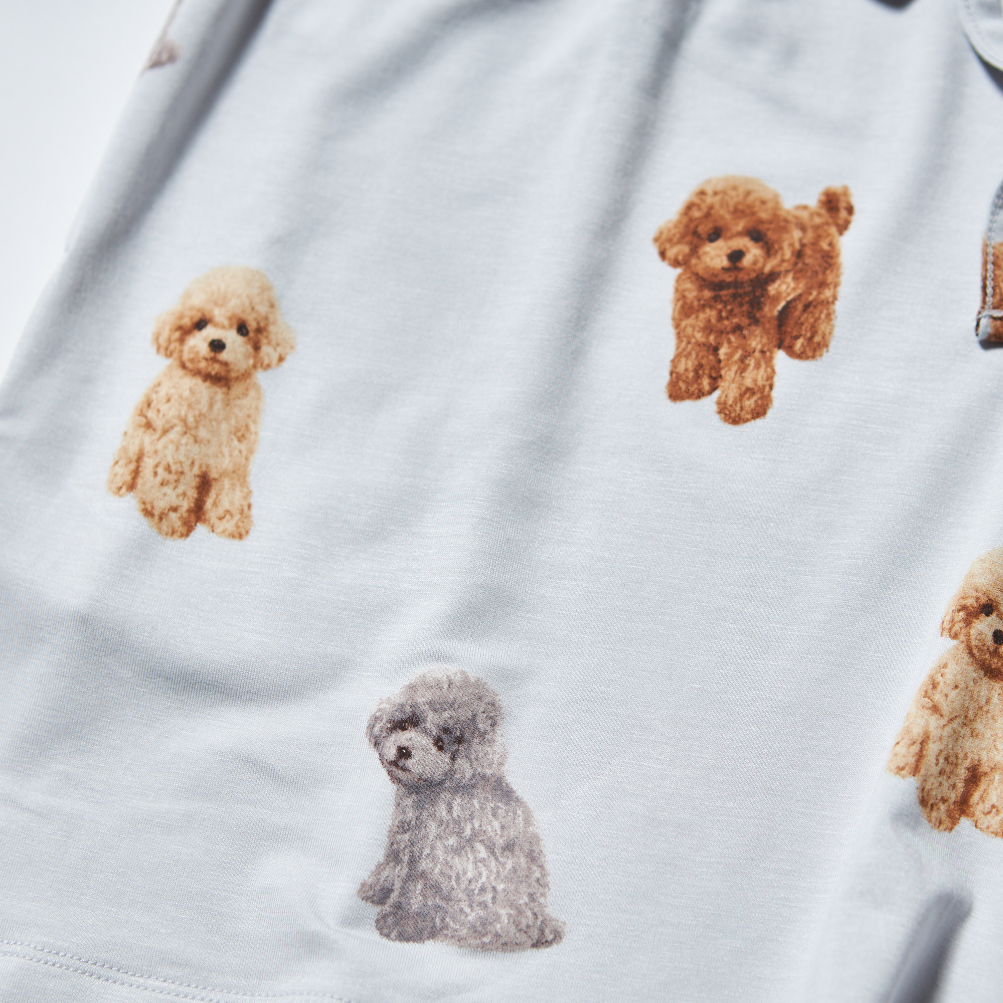 大口注文・法人のお問い合わせはこちらつぶらな瞳がたまらないふわふわトイプードルを、なめらかなカットソーにプリントしたカジュアルなルームウェアシリーズです。