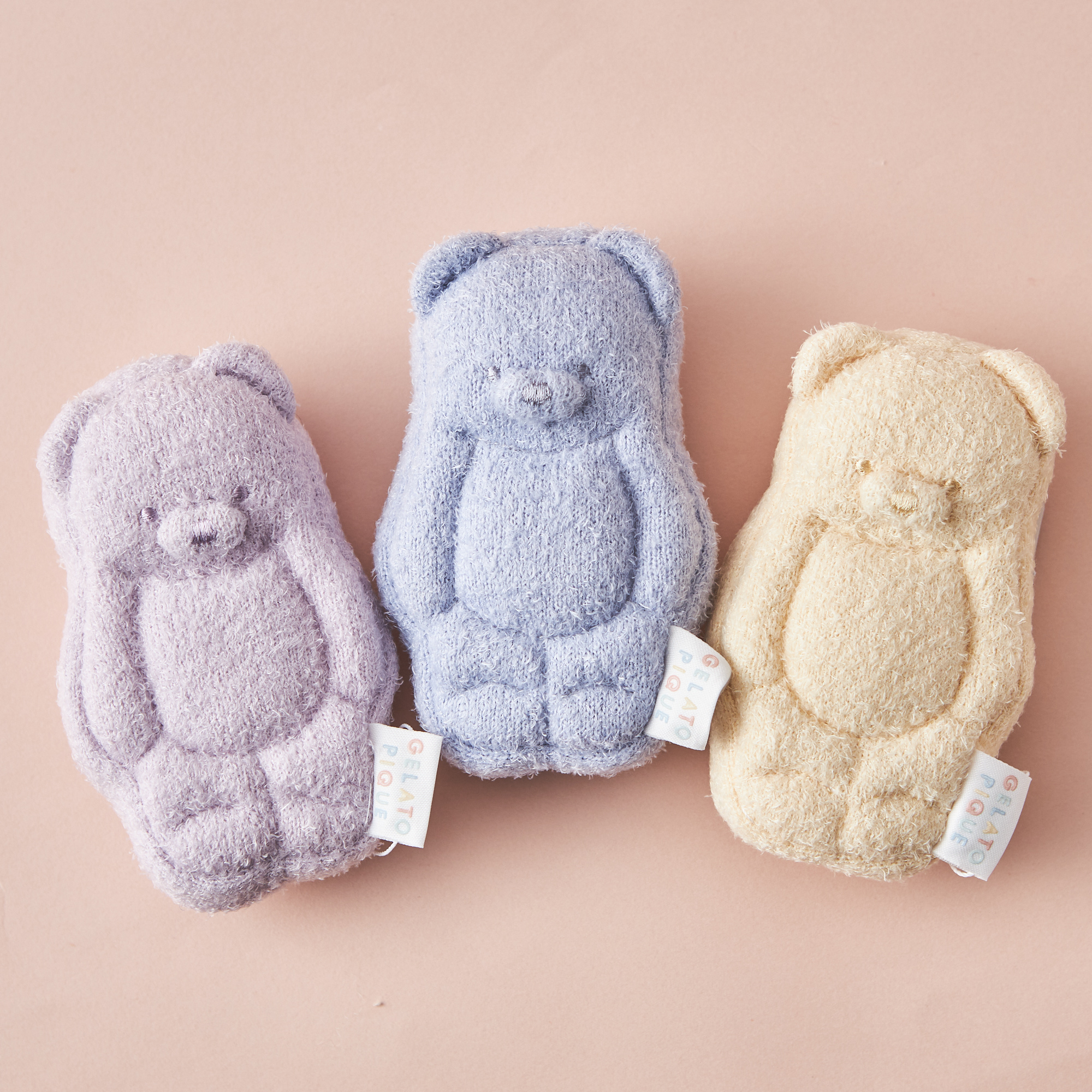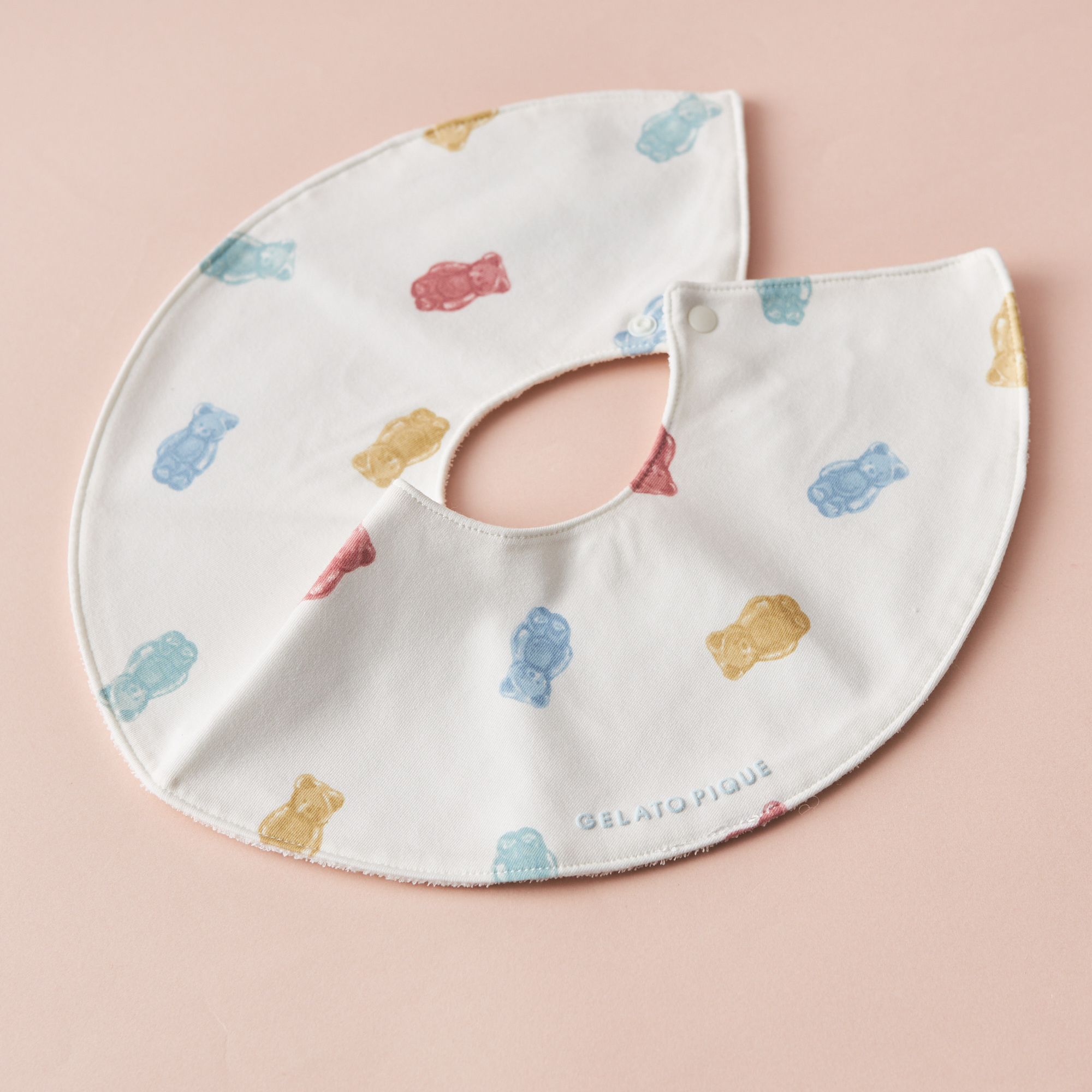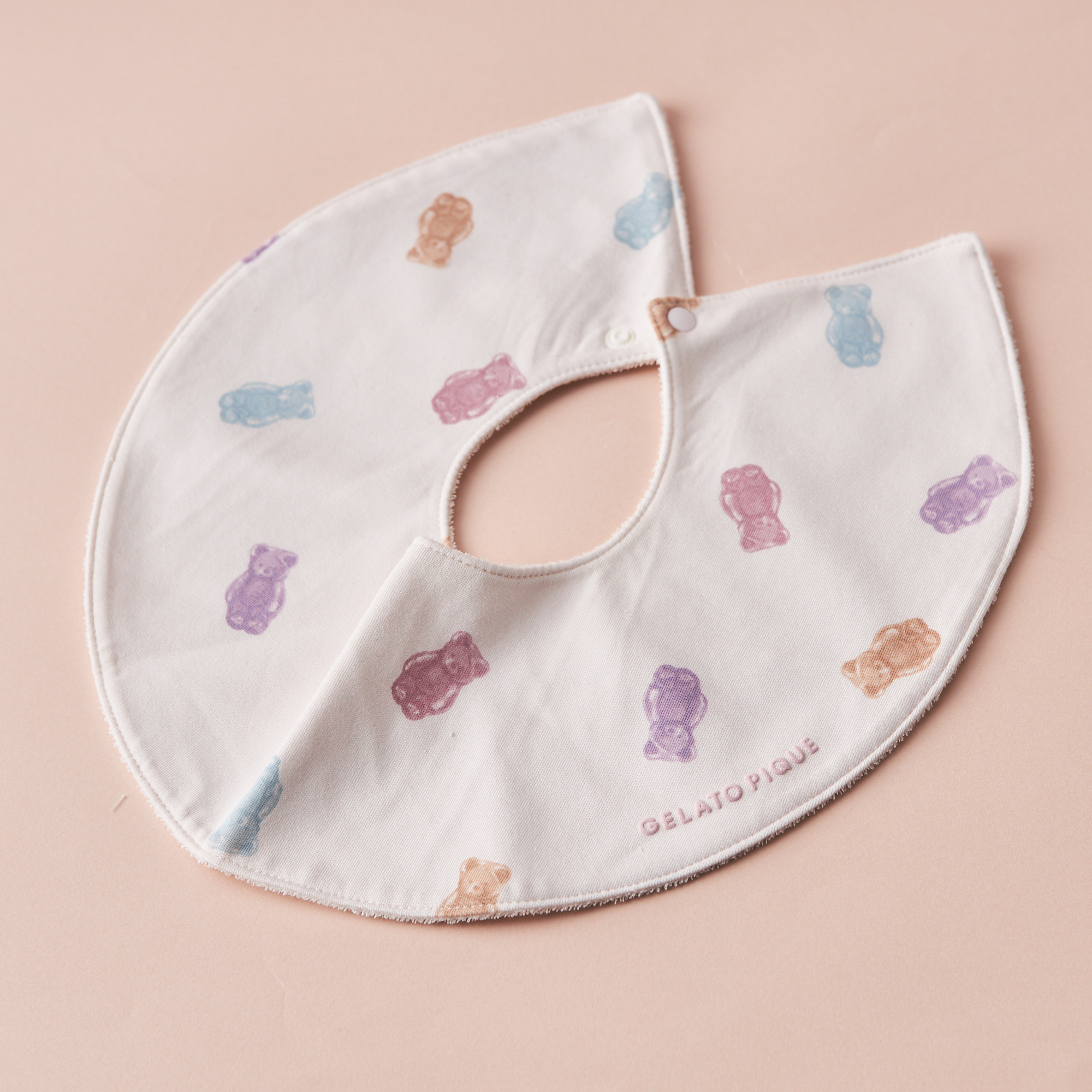 “大人のデザート”をコンセプトにしたルームウェアブランド「gelato pique(ジェラートピケ)」。グミのようにカラフルな「チューイーベア」たちを主役にした、ルームウェアとお揃いのBABY小物シリーズのラトルとスタイのセットです。