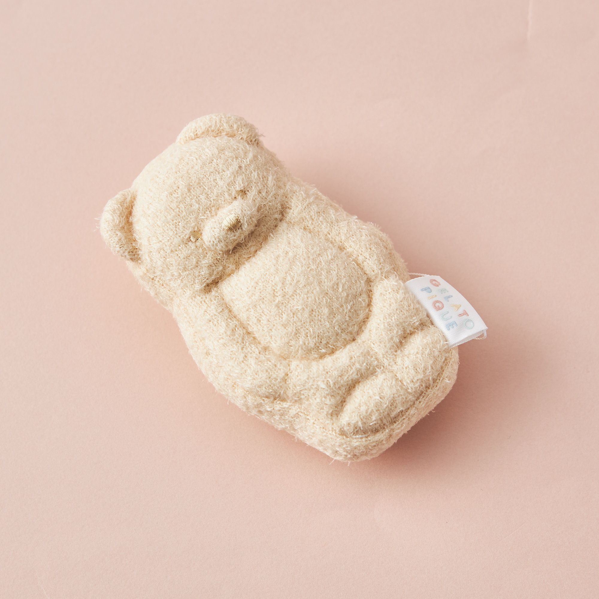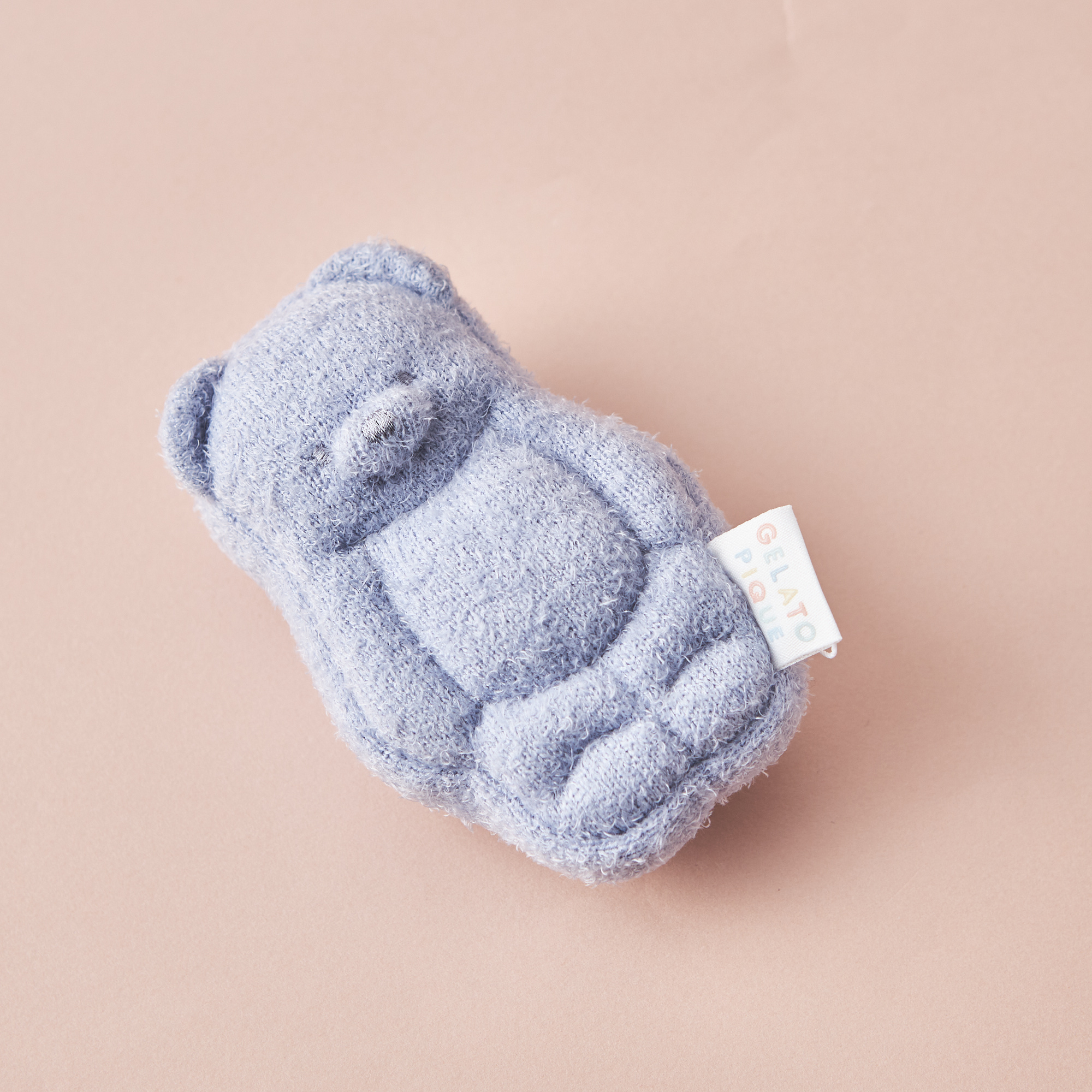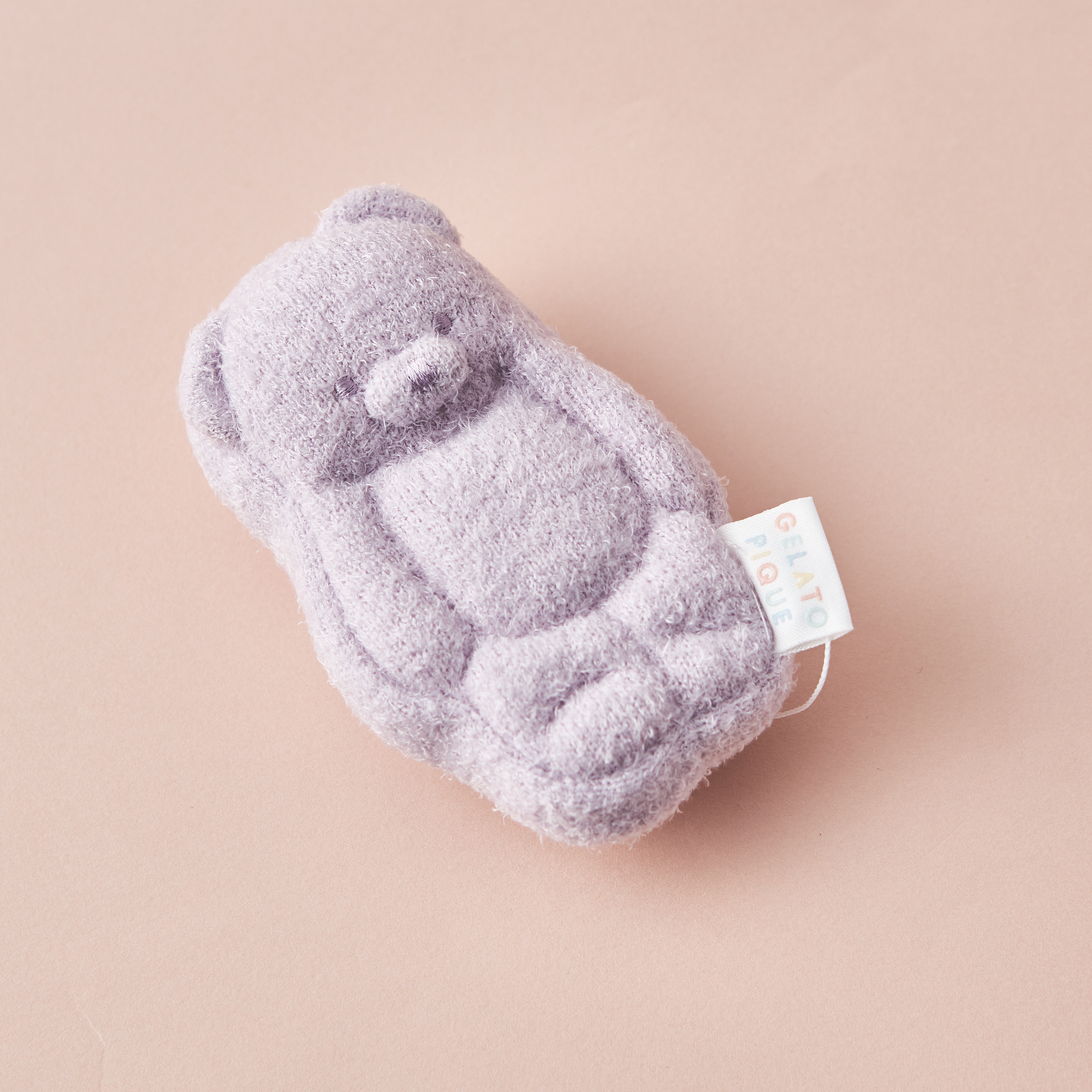 もこもこと愛らしい「スムーズィー」素材のチューイーベアをあしらったラトルは、POPなカラーリングにも癒されるアイテム。振ると優しい鈴の音が鳴って、赤ちゃんを笑顔にします。色はLAVENDERとBLUE、YELLOWの3色展開です。
