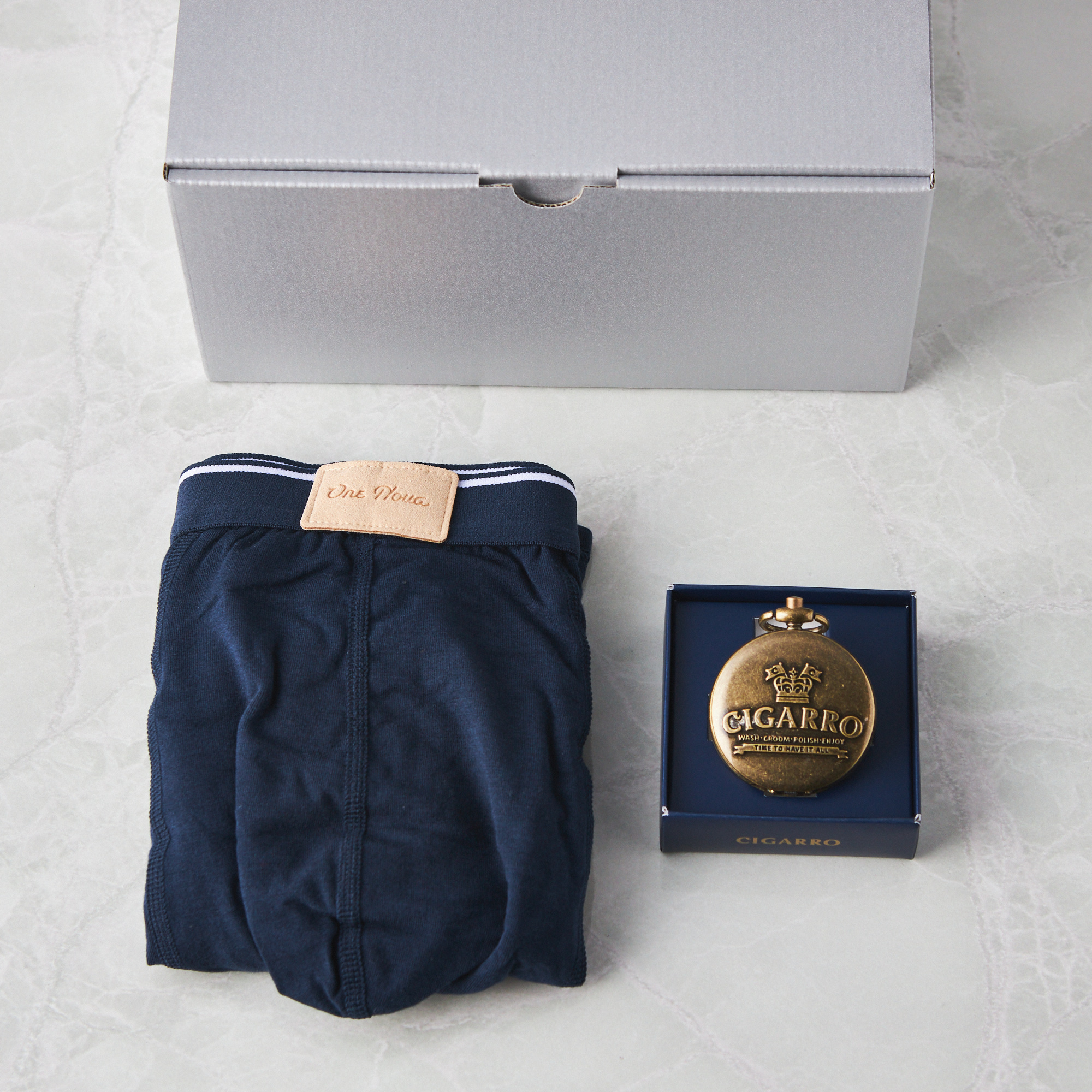 男性のためのパーソナルケアブランド「CIGARRO(シガーロ)」の練り香水と、日本発のアンダーウェアブランド「One Nova(ワンノバ)」のボクサーブリーフをセットでお届け。練り香水は懐中時計ケースに入っており、香りを纏うだけでなくワンポイントのアクセサリーとしても。ボクサーブリーフは機能性快適性を兼ね備えた、男性用の下着です。