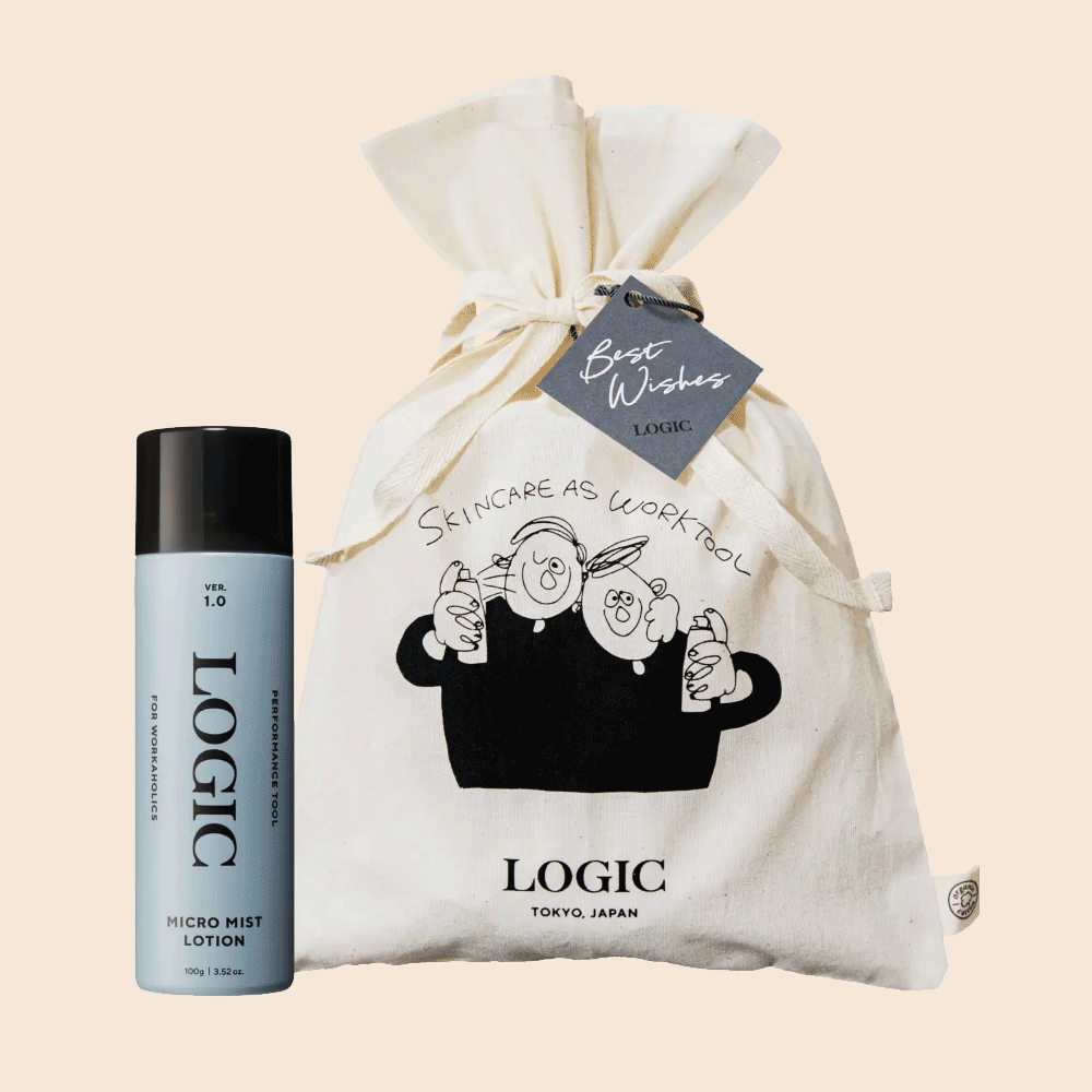 大口注文・法人のお問い合わせはこちらメンズコスメブランドLOGICと、イラストレーターとして活躍するオガワナツミさんのコラボレーションパッケージです。 顔にひと吹き、たった2秒で保湿ケアが完了するミスト化粧水をオガワナツミさんにイラストを描き下ろしていただいたオーガニックコットン製ギフトパッケージに包んでお届け。 忙しく働く人の、朝と夜のスキンケアを無理なく習慣化できるように、圧倒的な時間短縮にこだわりました。スキンケアの“めんどうくさい”を解消したLOGICで、新しいスキンケア体験を。