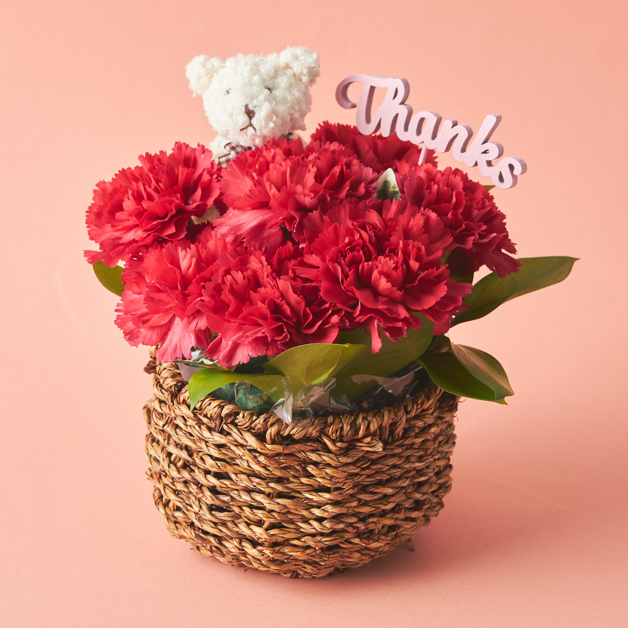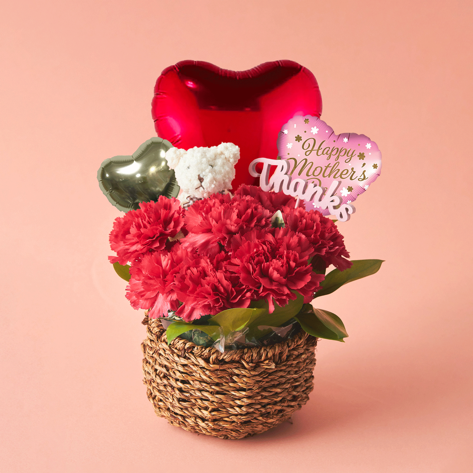 優しい雰囲気が漂う、赤を基調とした生花アレンジメント。母の日の贈り物にぴったりの、可愛らしさが溢れる一品。 ※写真はイメージです。開花状況等、写真と実際の商品が異なる場合がございます。