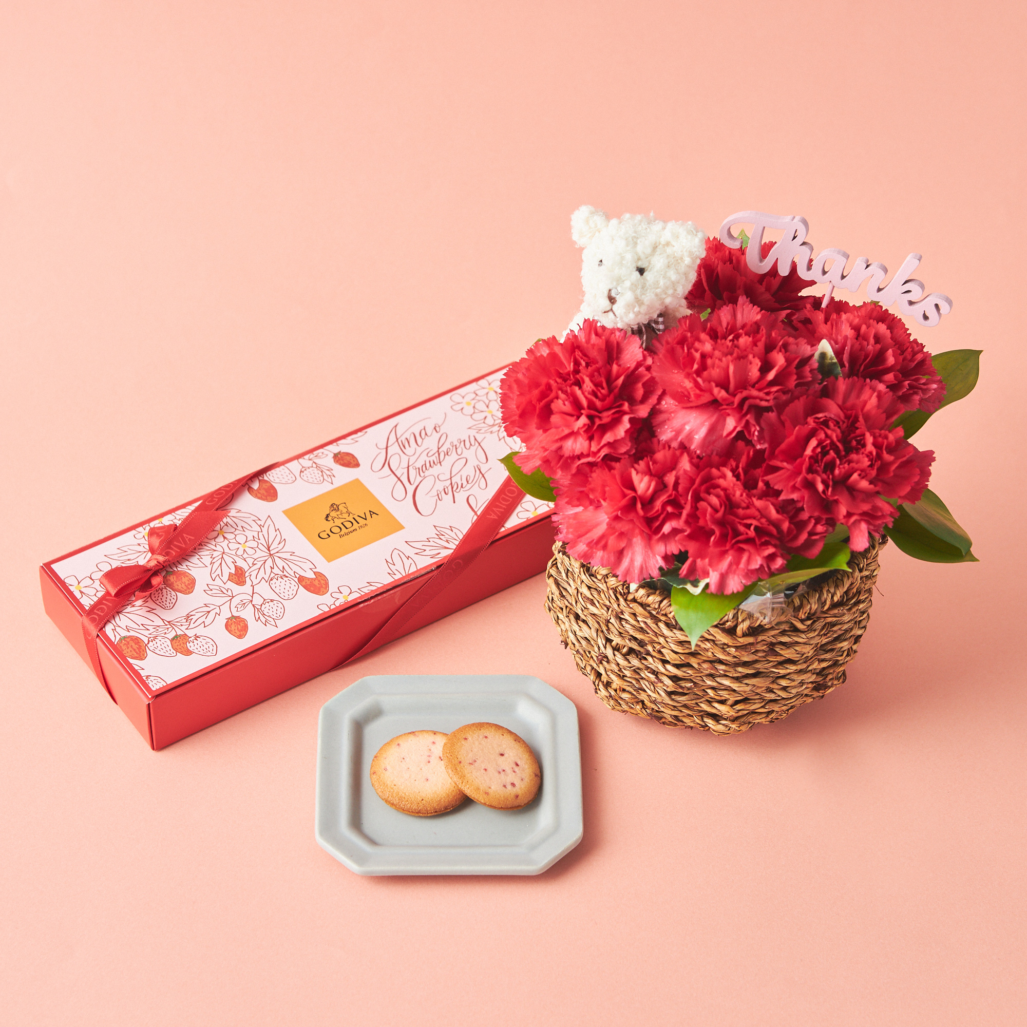 【5/13の7:00以降に頂いたご注文に関しては東京から5/14出荷となります】母の日の贈り物にぴったりな、「karendo(カレンド)」のフラワーアレンジメントをお届け。赤を基調とした優しい雰囲気が漂うアレンジメントです。普段なかなか口に出して言えない感謝の気持ちを、可愛らしいフラワーアレンジメントと、美味しい「GODIVA(ゴディバ)」のクッキーに乗せて伝えてみてはいかがでしょうか?