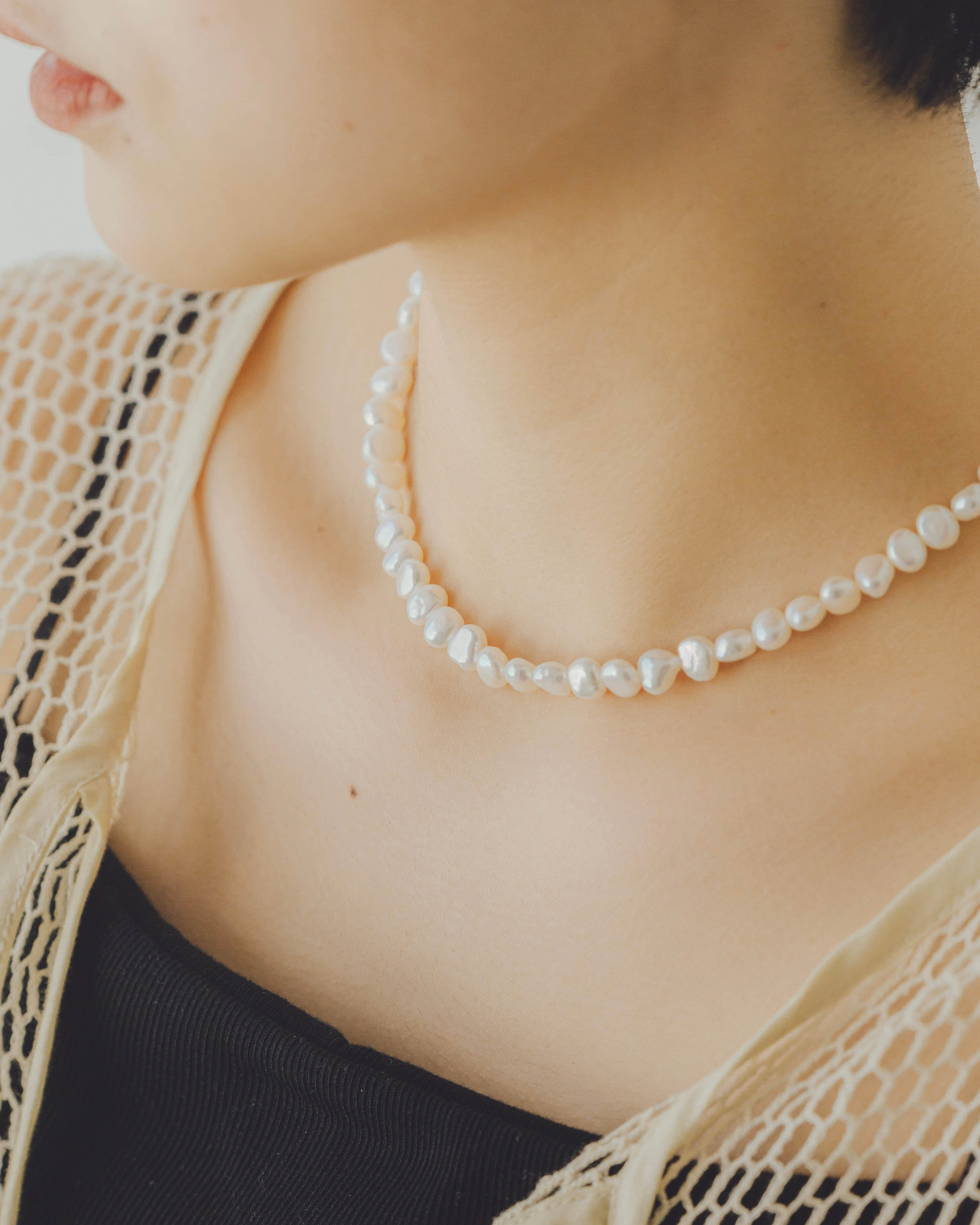 女性なら1本は持っておきたいパール。これは不揃いでナチュラルな小粒のバロックパールだからこそ、普段使いにも最適です。 きれいめなコーディネートやカジュアルなコーディネートにも合わせやすく、結婚式などのパーティーシーンにもおすすめのネックレスです。 ※淡水パールは天然素材のため一粒一粒ごとに形が異なります。