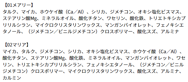 | 外装サイズ | 【アイシャドウ】 直方体紙箱 縦82mm×横114mm×高さ37mm 【リップ】 直方体紙箱 縦72mm×横50mm×高さ25mm |