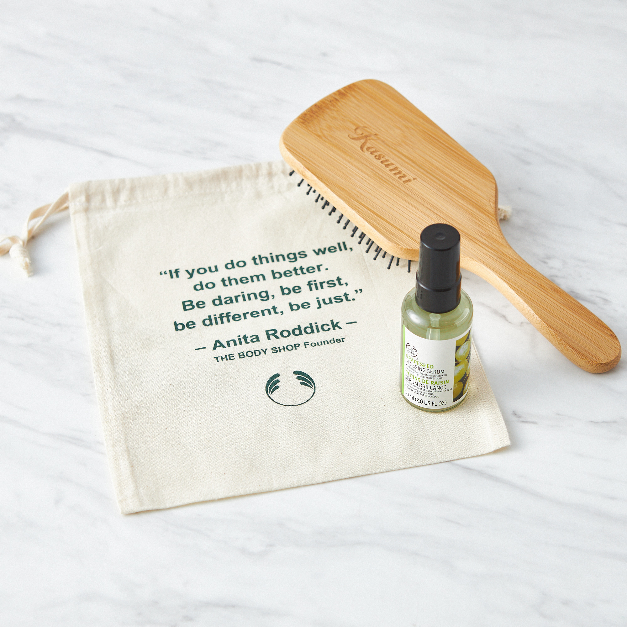 世界60カ国以上に3000店舗以上を展開する「THE BODY SHOP(ザボディショップ)」のヘアブラシとヘアセラムをセットでお届け。ヘアブラシは髪のもつれをやさしくほどき、まるでシルクのようなストレート、なめらかなカールに仕上げます。ヘアセラムはグレープシードオイルとセサミオイルが、パサついた髪に潤いを与え艶のある髪に導きます。