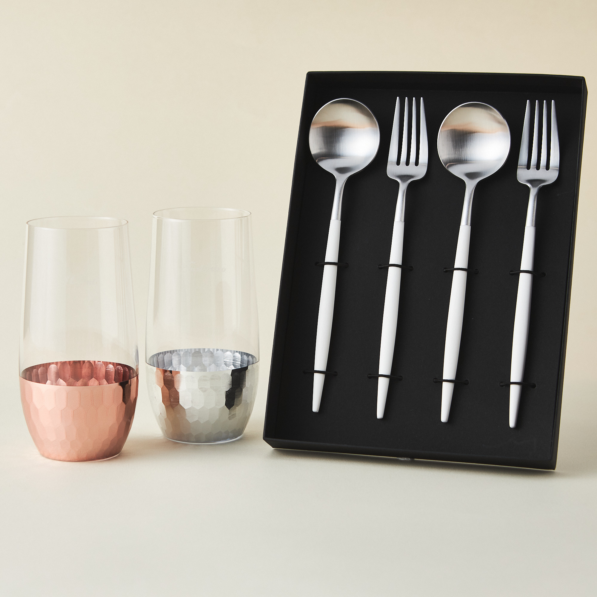 フランス語で煌めきを意味するbrillant(ブリアン)のペアタンブラーとプレートセットとポルトガルのカトラリーメーカー「クチポール」のゴアホワイト×シルバー4本セットをお届け。結婚祝いなどペアグッズの贈り物におすすめです。