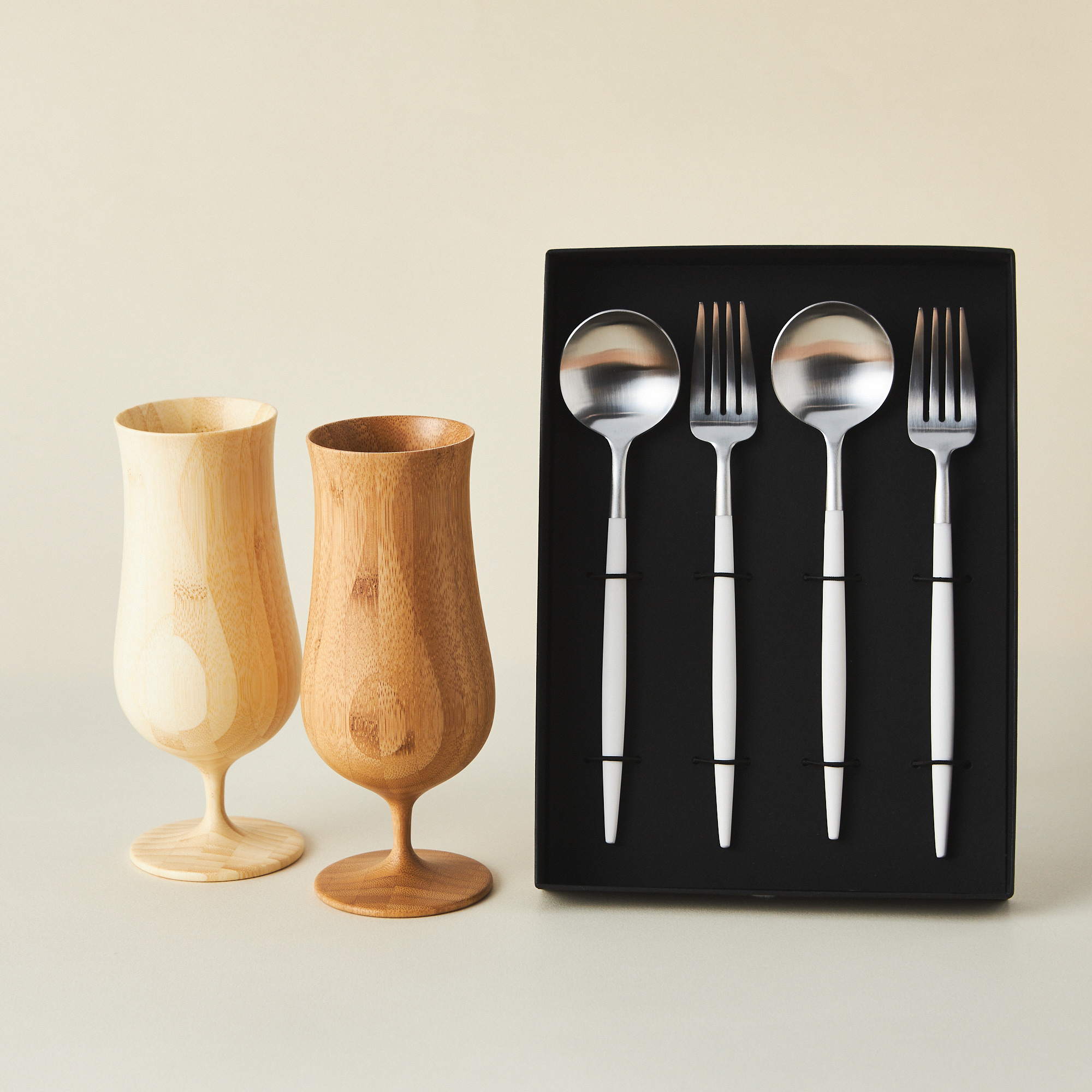 天然素材のナチュラル感を保ちつつ、よりスタイリッシュな印象にデザインされたペアビアグラスとポルトガルのカトラリーメーカー「クチポール」のゴアホワイト×シルバー4本セットをお届け。結婚祝いなどペアグッズの贈り物におすすめです。