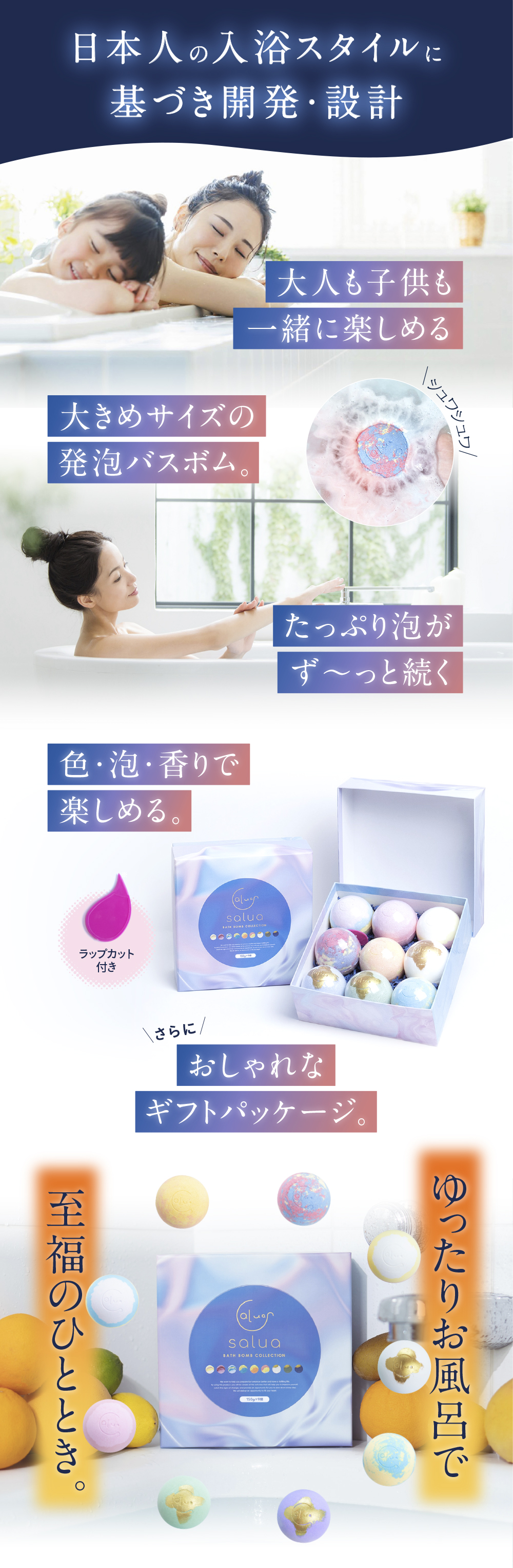 さまざまなシーンの贈り物としていかがでしょうか? - バスタイムが好きな方 - バスタイムが苦手なお子様に楽しんでもらうために - スキンケアに興味がある方にプレゼントするときに