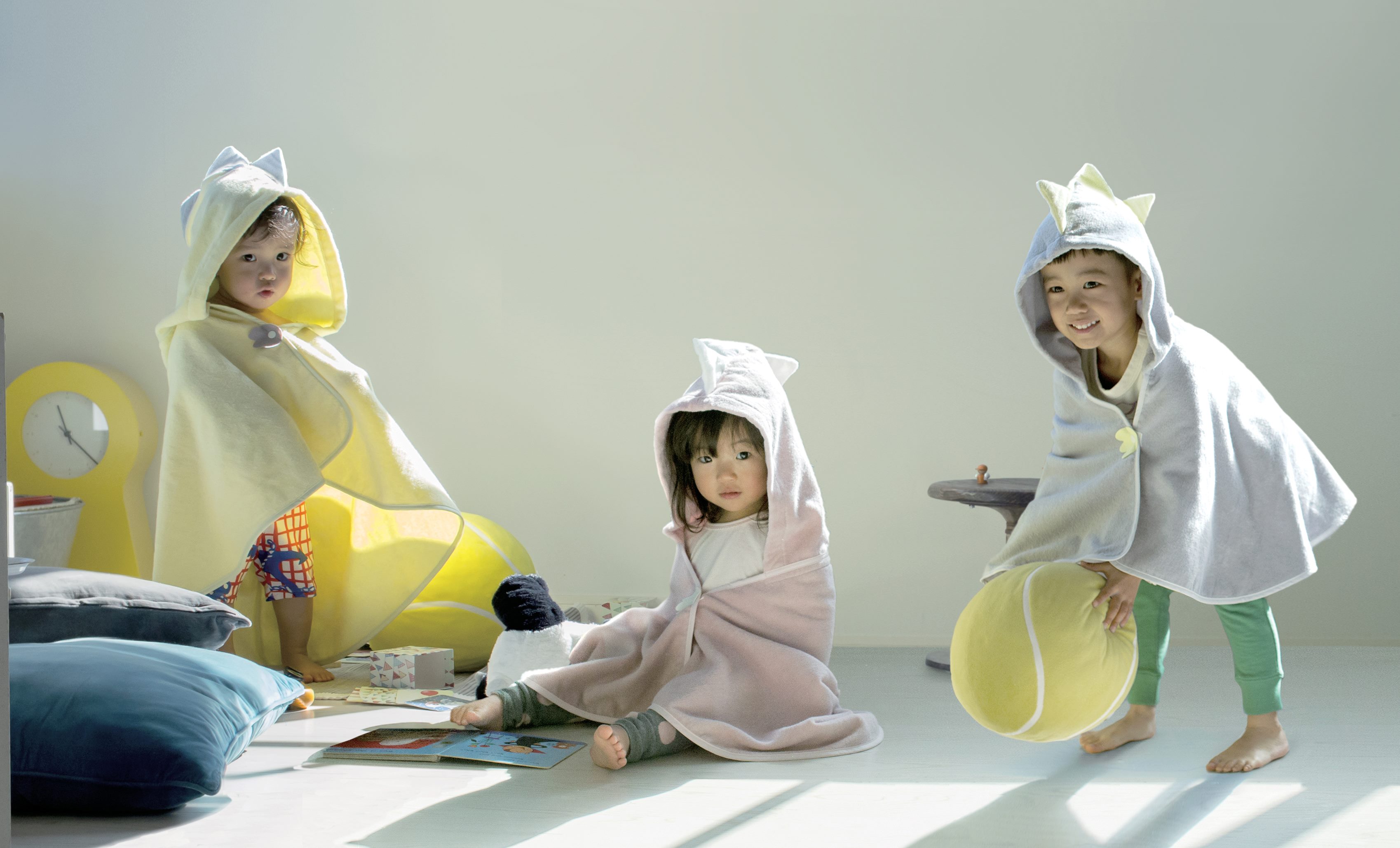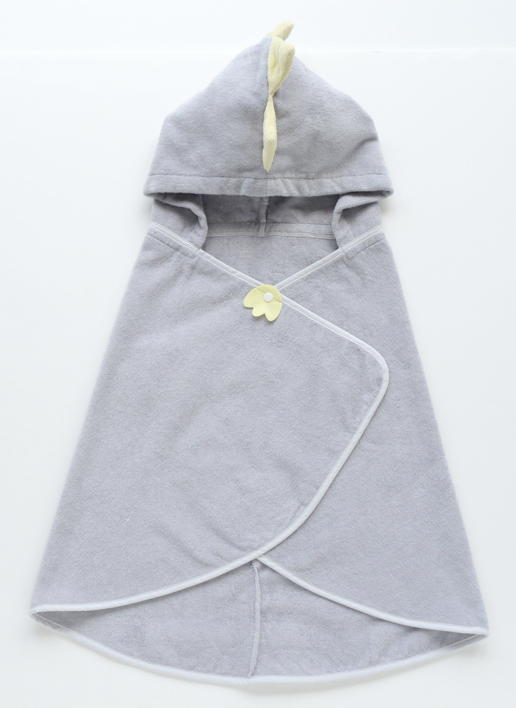 フードをかぶれば、かわいい恐竜に大変身!お子さまが大好きな「恐竜」をテーマに、遊び心あふれる商品を作りました。お風呂上りやプール、ブランケット代わりとしてなど、様々なシーンでお使いいただけます。