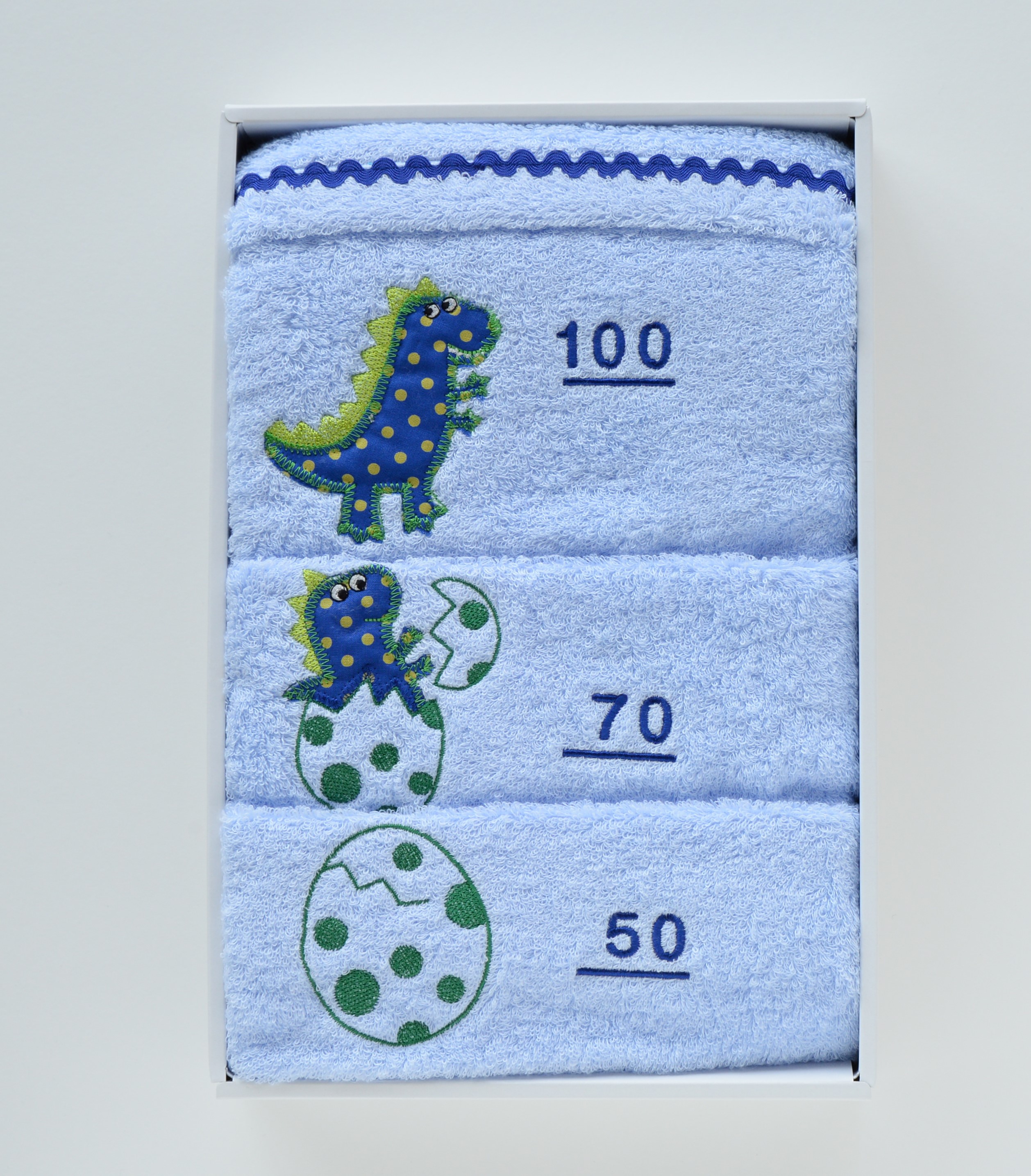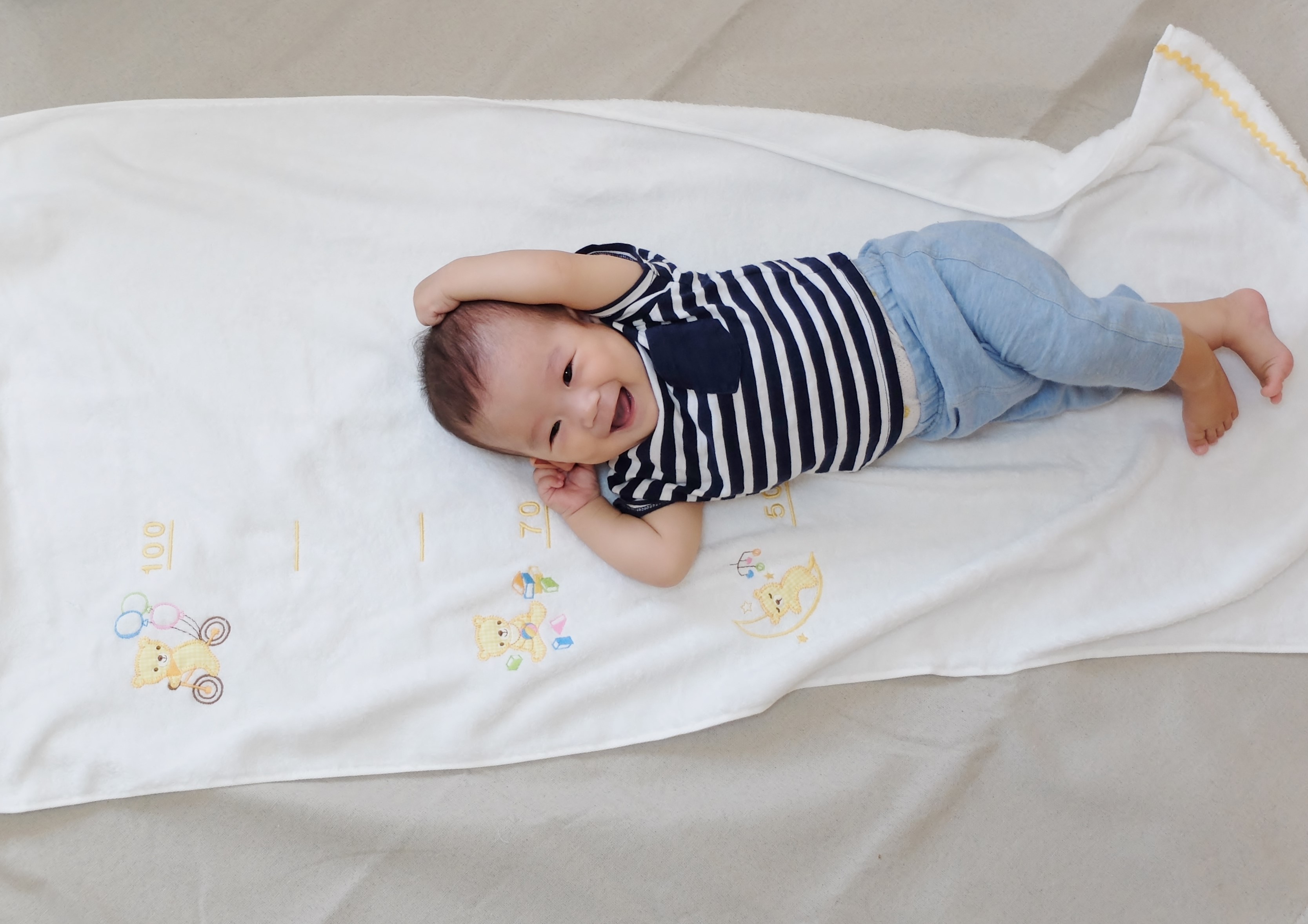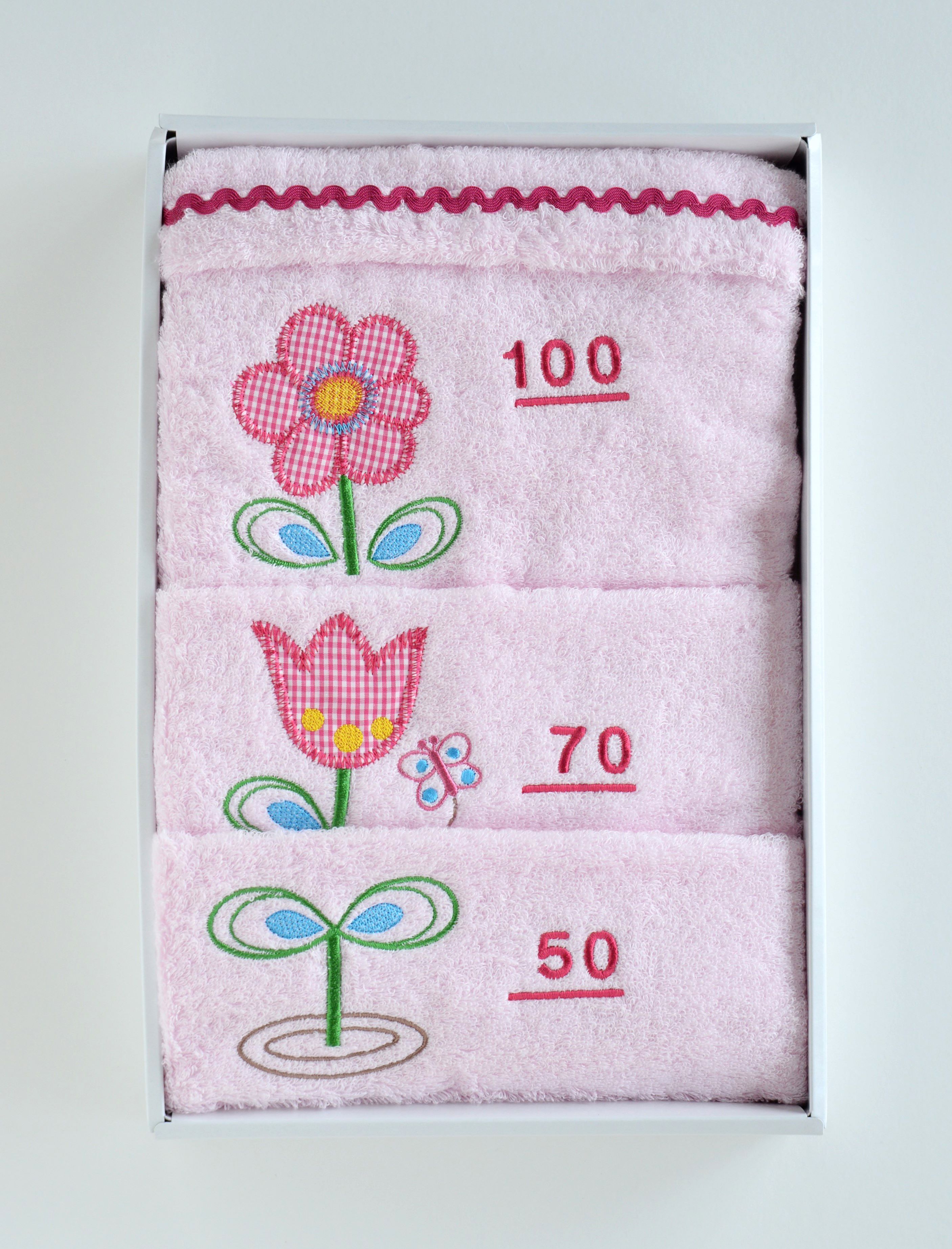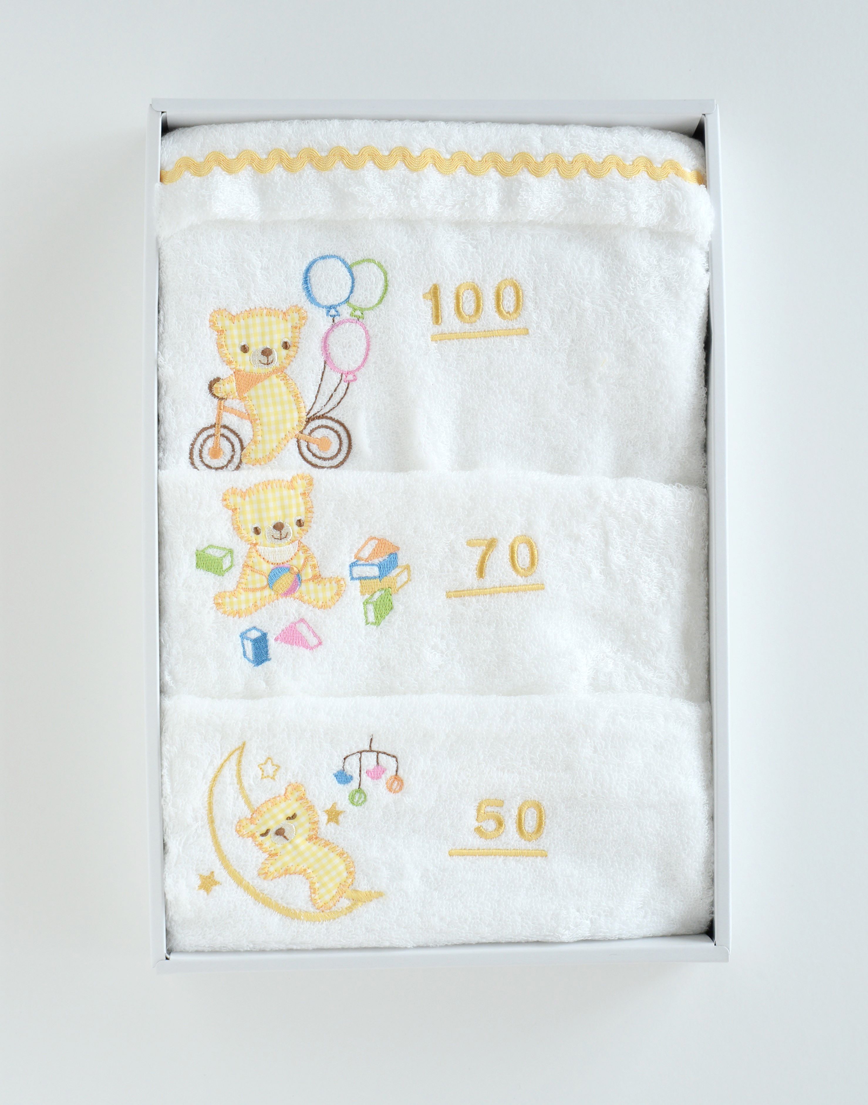 大口注文・法人のお問い合わせはこちら50cmから100cmまで、10cmごとに目盛りを刺繍しました。 3つのアップリケ刺繍は、赤ちゃんの成長をイメージしたストーリーになっています。身長が測れるタオルとしてはとてもめずらしい刺繍タイプ。やわらかさ、軽やかさ、そして吸水性がある今治タオルです。ギフトボックス入りで出産祝いのプレゼントにもおすすめ。 今治タオルブランド認定番号:第2015‐1564号