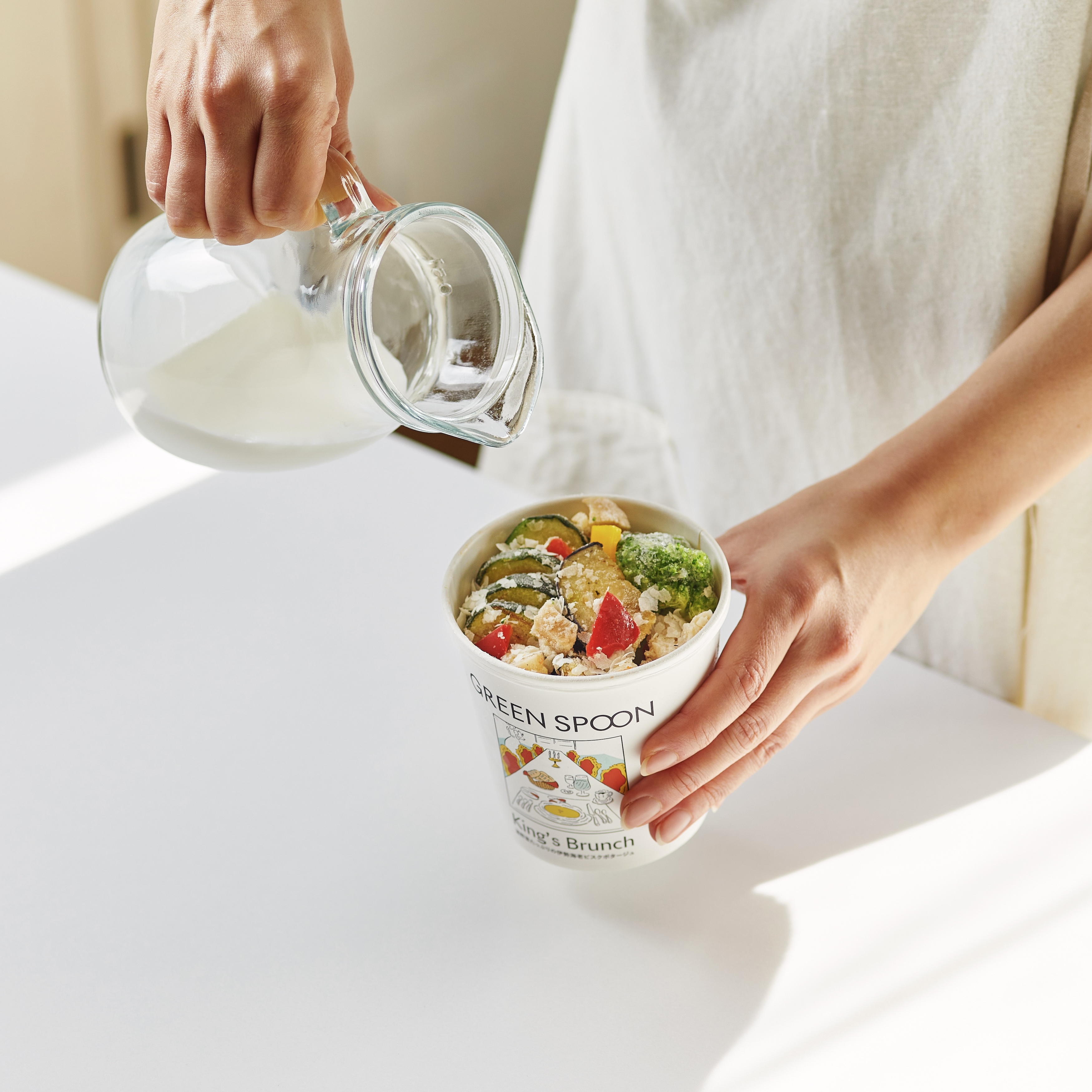 容器に⽔(または⽜乳、植物性ミルクなど)を加え、レンジで5分温めるだけで完成します。 トッピング等で⾃分好みにアレンジするのも楽しみ⽅のひとつ!