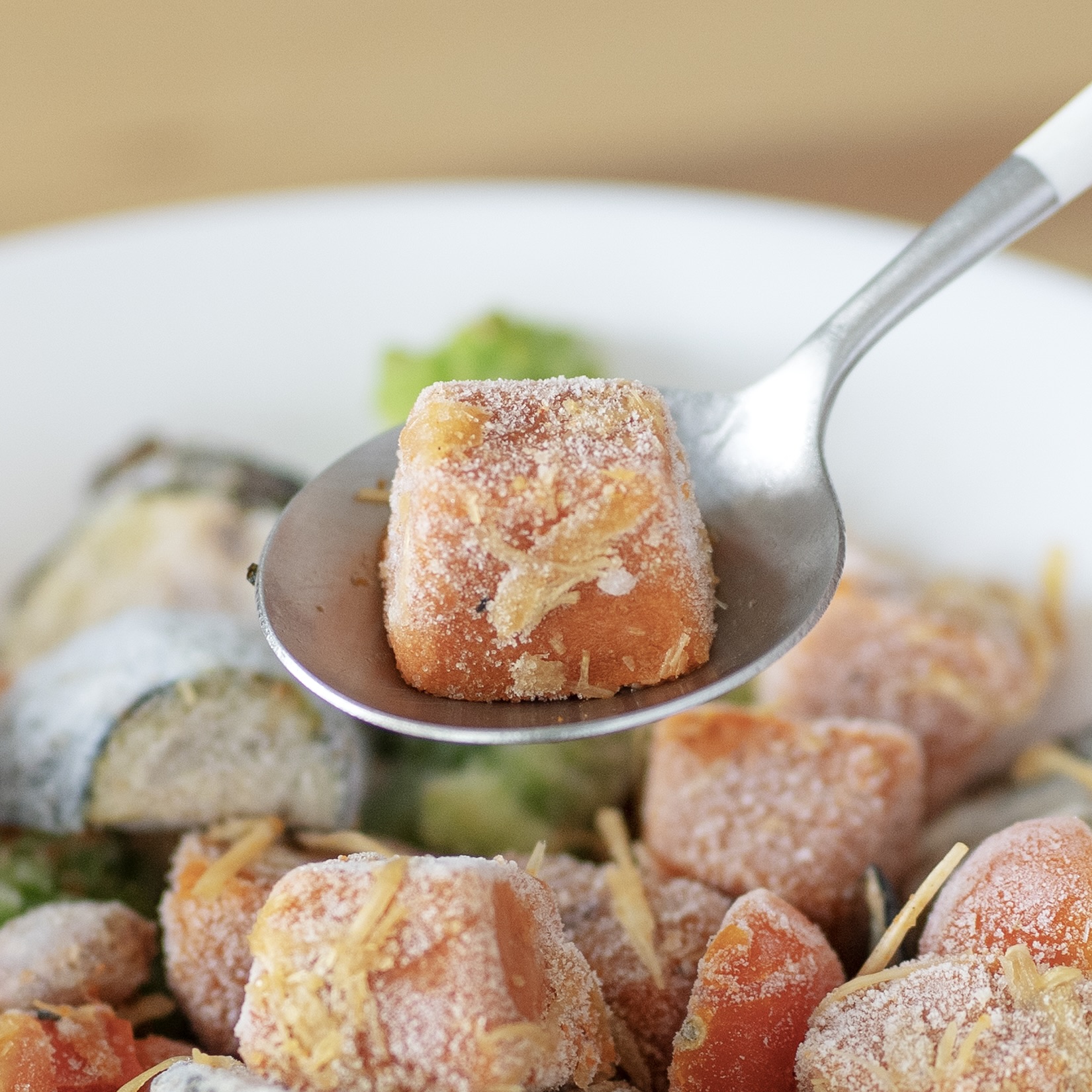 GREEN SPOONのスープは、旨味がぎゅっと詰まったキューブ状で届きます。野菜 とは別々に凍っているため、冷凍とは思えない野菜の⾷感を実現しています。