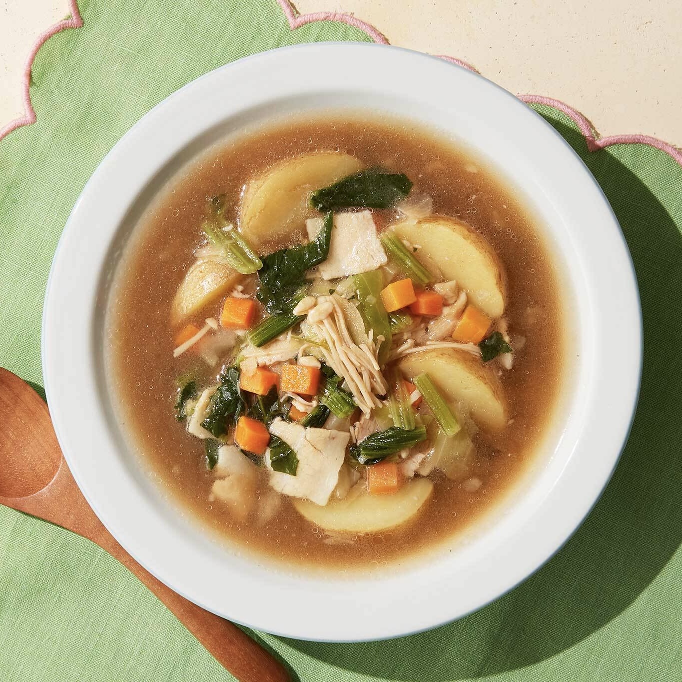 飴色になるまで煮詰めた玉ねぎときのこの旨味が詰まったポルチーニ香る洋風コンソメスープ。なめらかでもっちりした食感の北海道産じゃがいもと、きのこの旨みがぎゅぎゅっと詰まった優しいコンソメスープは相性が抜群。 原材料:じゃがいも加工品(じゃがいも、植物油脂)(国内製造)、豚バラ肉(スペイン)、キャベツ(中国)、にんじん、ほうれん草、オリーブオイル、コンソメ顆粒、フライドオニオン、オニオンソテー、乾燥えのき、もち米でん粉、えのきパウダー、塩、シャンピニオンエキス、ポルチーニパウダー、黒こしょう、(一部に大豆・豚肉・鶏肉・ゼラチンを含む) ※アレルギー:大豆・豚肉・鶏肉・ゼラチン 内容量:173g カロリー:157kcal