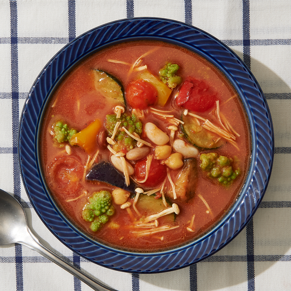 トマトのフレッシュな甘みと10種のゴロゴロ具材をリッチに味わう、GREEN SPOON特製ミネストローネ。隠し味に甘酒を加え、ナチュラルな甘みと新鮮なトマトの旨みを引き出した自慢のスープです。 原材料:ロマネスコ(中国又はエクアドル)、揚げなす、チェリートマト(トルコ又はペルー)、赤黄パプリカ、グリルズッキ―ニ、甘酒(米、米こうじ)、トマトピューレ、ミックスビーンズ、トマトペースト、野菜ブイヨン、乾燥えのき、オリーブオイル、トマトパウダー、えのきパウダー、オニオンジュース、片栗粉、もち米でん粉、赤パプリカパウダー、シャンピニオンエキス、(一部に大豆・ごまを含む) ※アレルギー:大豆・ごま 内容量:206g カロリー:128kcal
