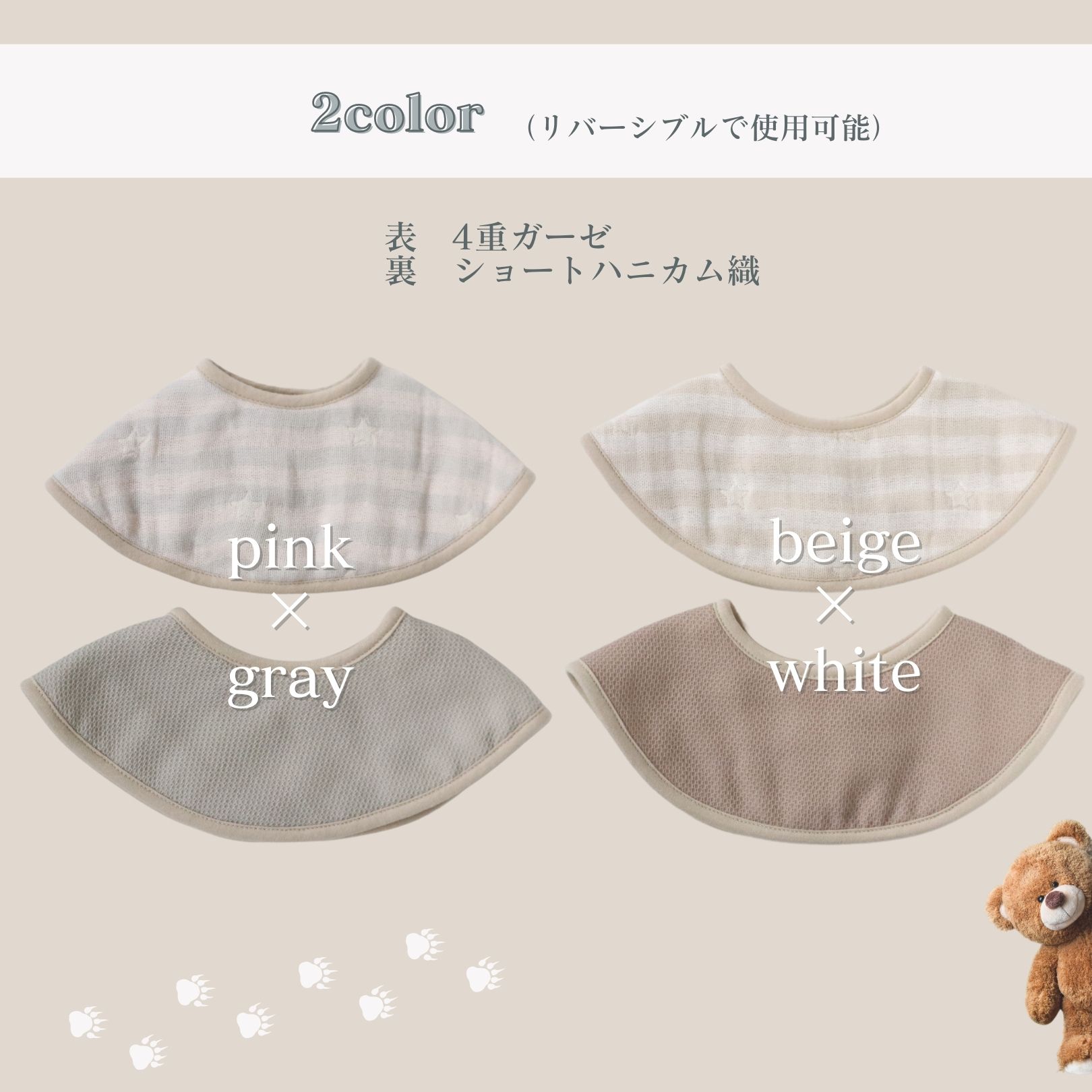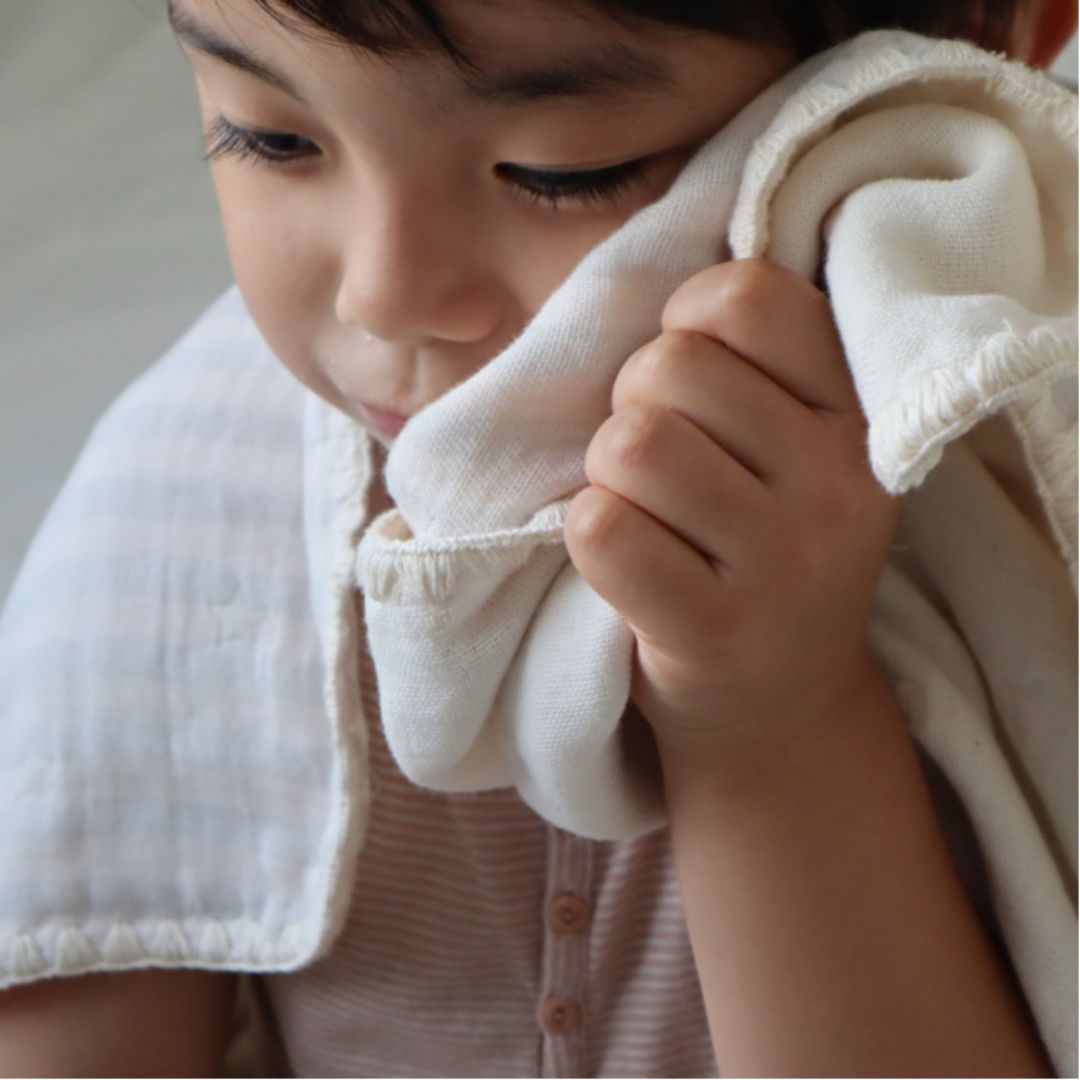 | サイズ展開 | マルチケットSサイズ:約70cm×100cm スタイ:約 横直径28cm首まわり約29cm miniハンカチ:約20cm×20cm |