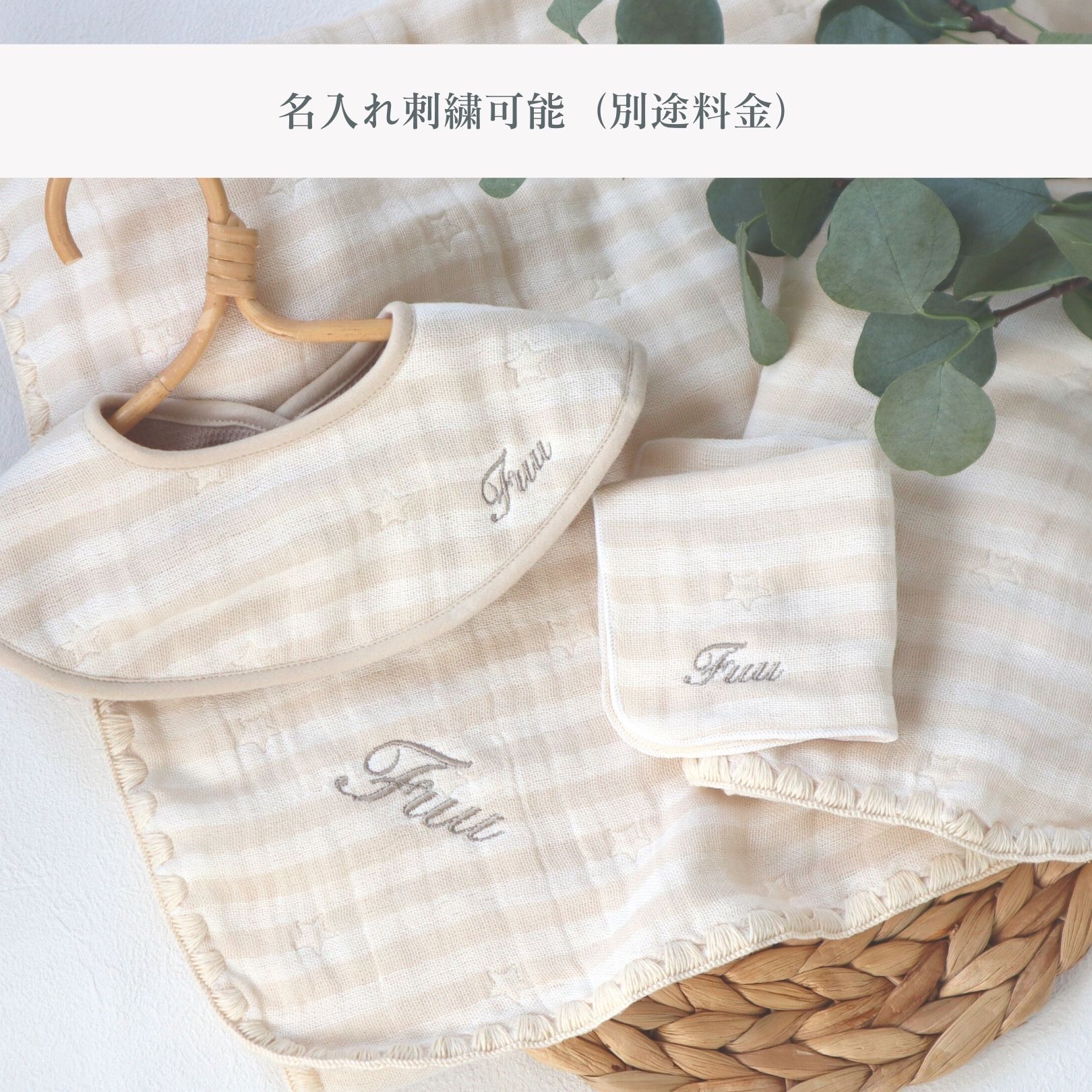 有料オプションで刺繍名入れを行うことも可能です。 ご出産祝いやハーフバースディ・1歳のお誕生日など、ベビーに必須な3アイテムがセットになっています。特別感のあるプレゼントを送ってみてはいかがでしょうか。