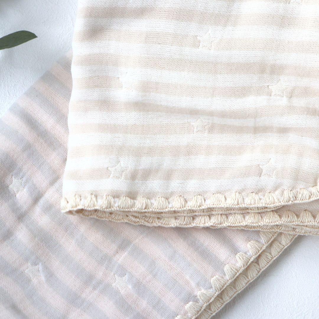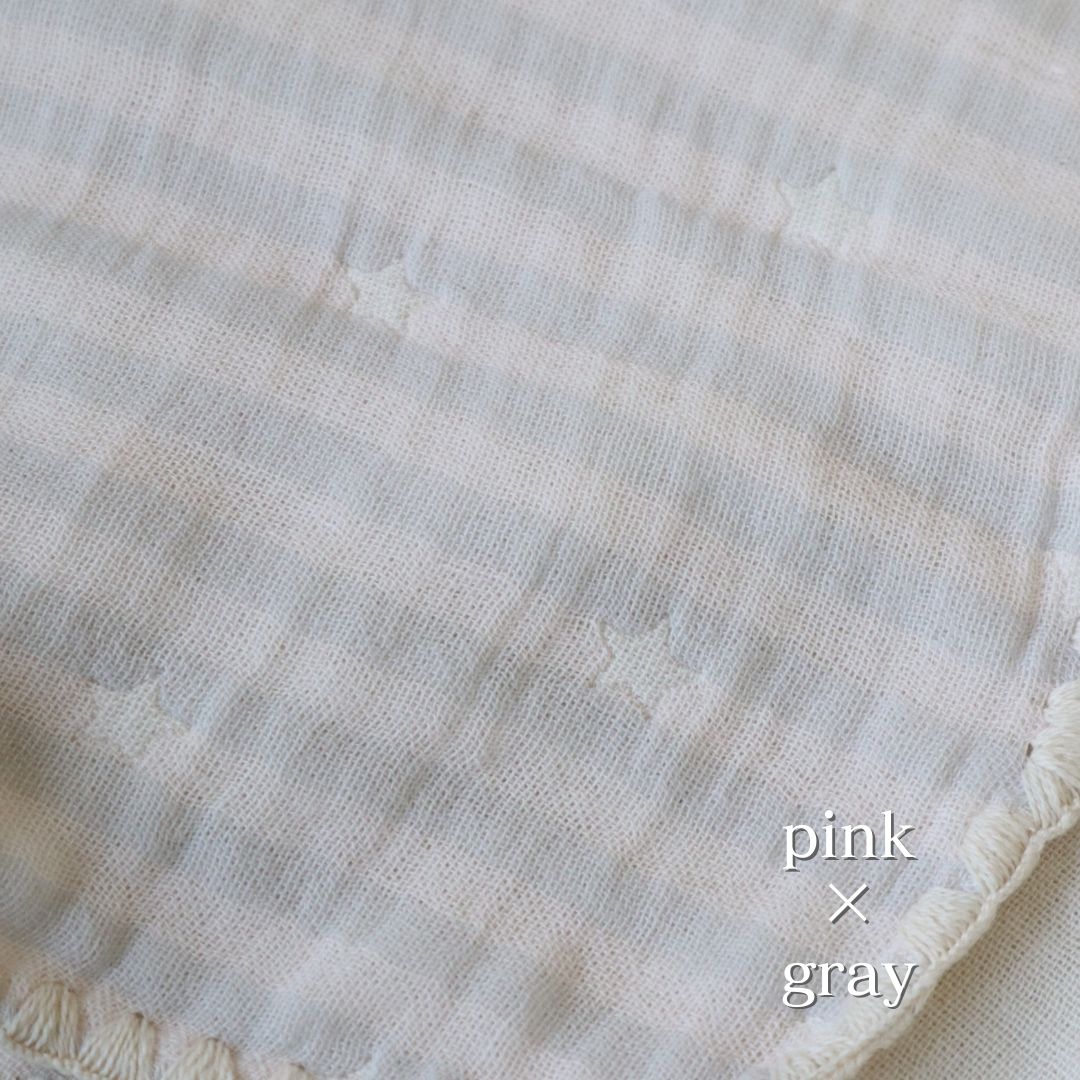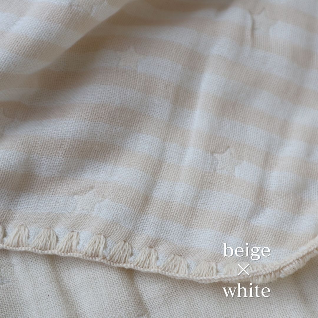 コットン100%のガーゼ生地で、肌触りがふわふわ。ペールカラーのボーダーに星柄が織り込まれたナチュラルで性別問わず使いやすいデザインです。 マルチケットはお昼寝時やベビーカーケットなど使い勝手の良く1枚は持っていたいアイテム。 スタイの裏面は吸水性の高いショートハニカム生地で、リバーシブルでご使用いただけます