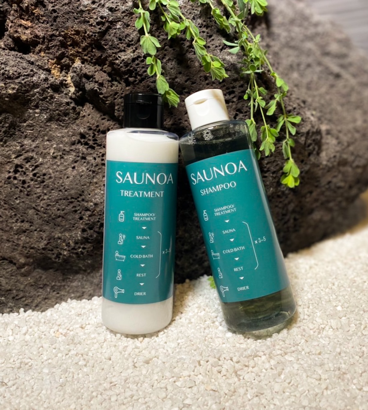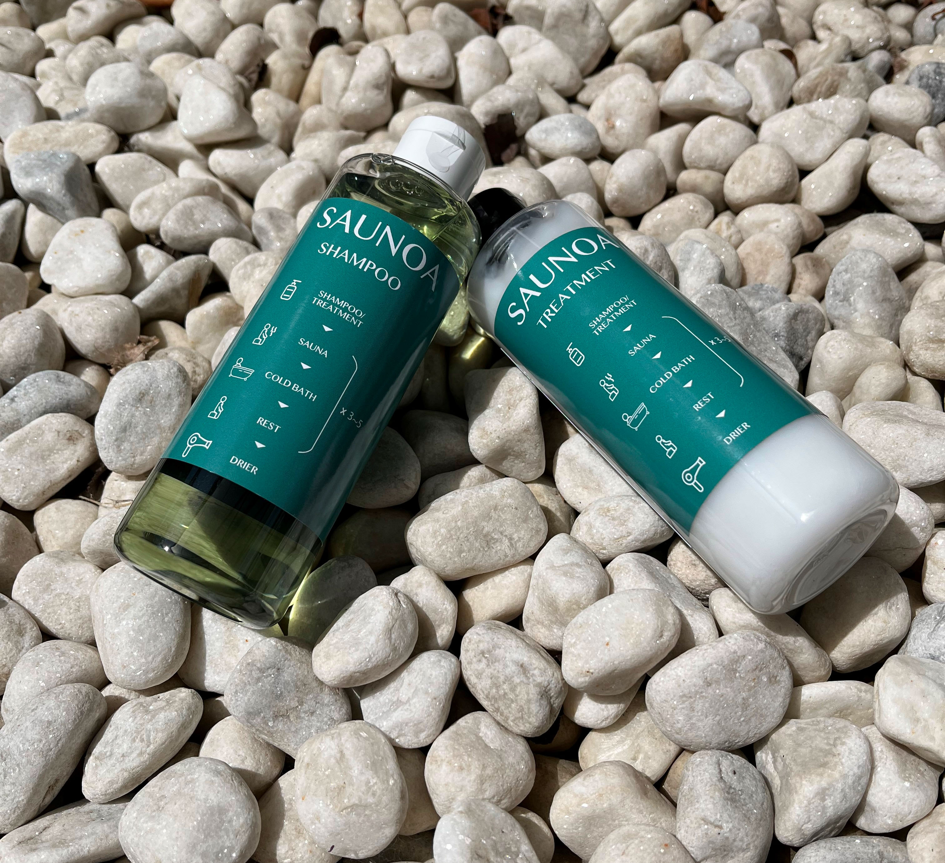 SAUNOA シャンプー&トリートメントは、フィンランドの森の香りが漂うサウナ用美容製品。熱保護成分と天然保湿成分が髪と頭皮を守りながら、サウナ後のリフレッシュ感を提供します。