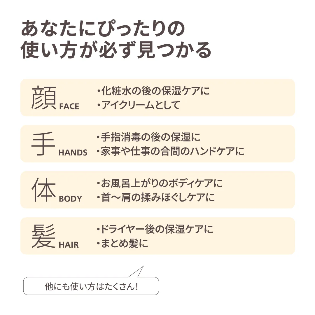 朝晩のフェイスケア、シャワー後のボディケア、いつものハンドケア、ヘアケアにも。
