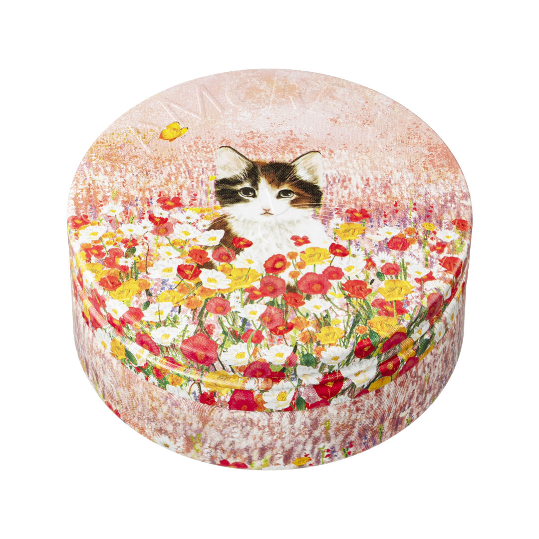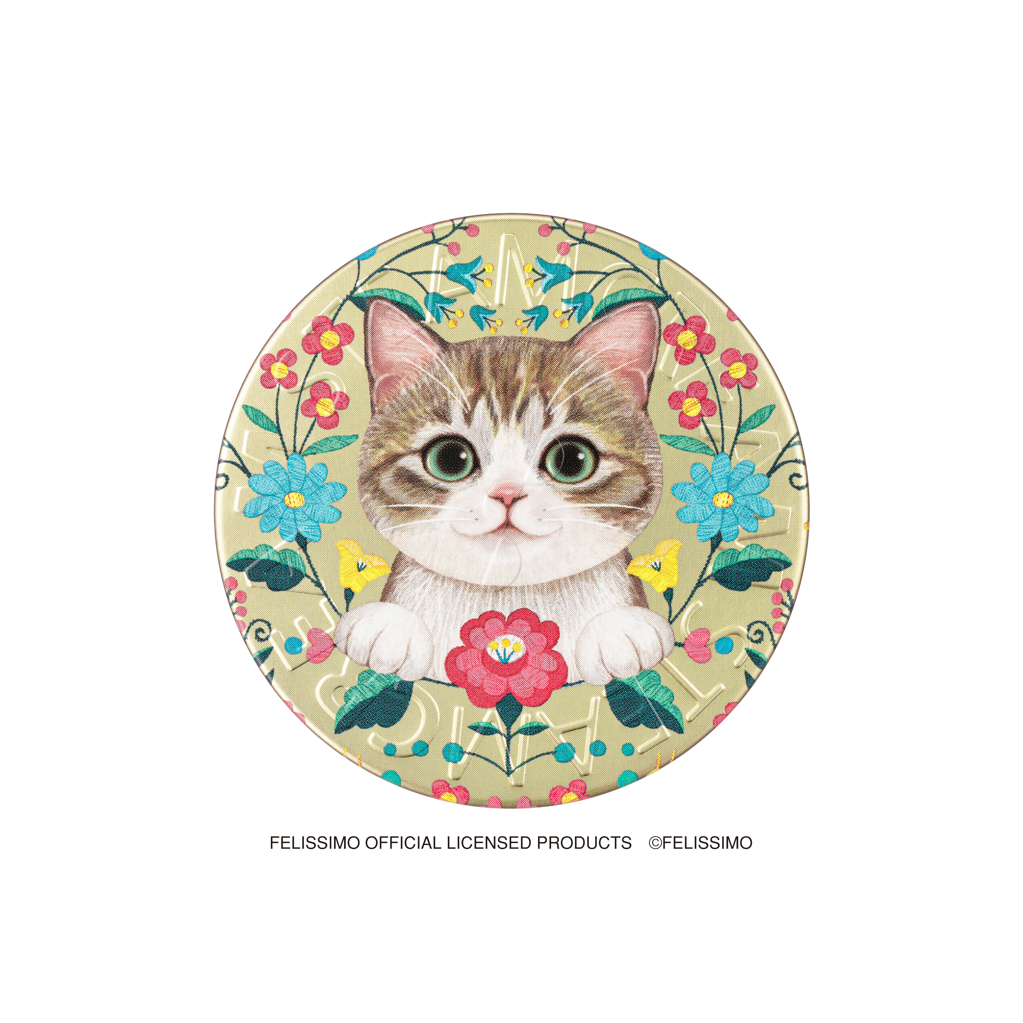 つぶらな瞳のキジ白猫さんにキュン。 可愛さあふれる花の中から、ひょっこり登場。 愛くるしい顔で、こんにちは。