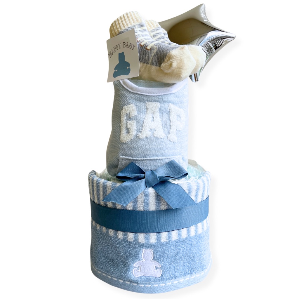 大口注文・法人のお問い合わせはこちら贈り物として人気のあるGapBabyのアイテムを使用したおむつケーキです。 贈る側も受け取る側も嬉しいとってもおしゃれなおむつケーキ。実用的なスタイ、タオル、ベビーソックスがセットになってます。 オムツでつくられたダイパーケーキは、ギフトとして大変注目されております。