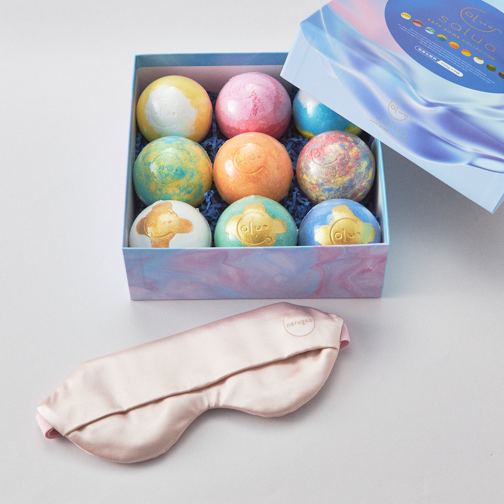 大口注文・法人のお問い合わせはこちらアロマオイルを配合した9種類のバスボムと、高級シルク100%で作られたホットアイマスクをセットでお届けいたします。 最近お疲れの方へ癒しの贈り物を。 大切な方へのお祝いやお礼にいかがでしょうか?